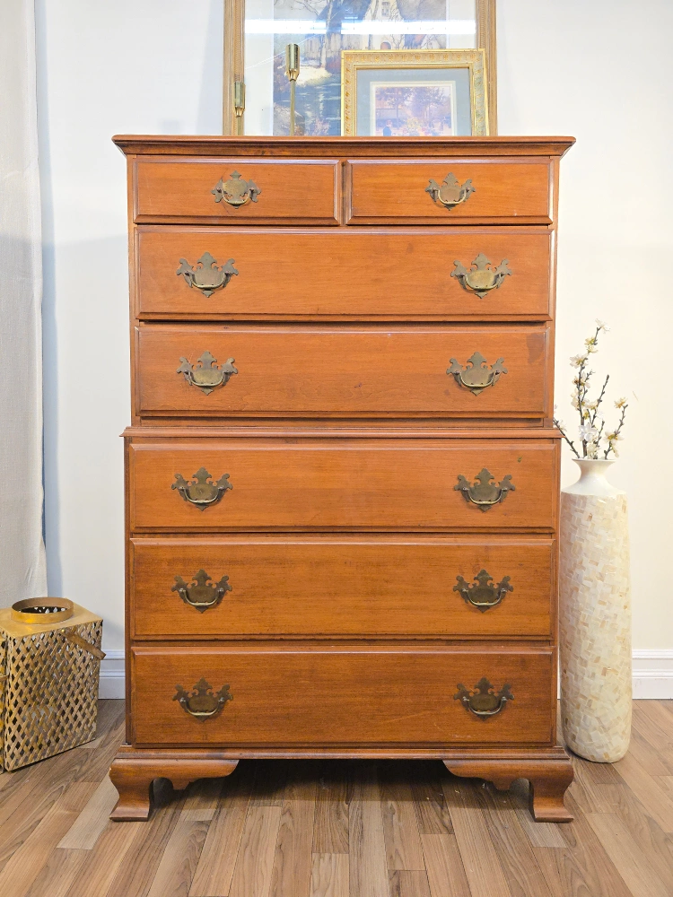 83Here's a classic wooden dresser with six drawers! It's a great piece for adding storage and a touch of traditional style to any room. The dresser features ornate brass-colored handles and a warm wood finish. It's in good condition and ready for a new home 🚚   Free Delivery We are focused in selling high quality used furniture! INSTAGRAM ed.furniture.design.llc                                                        🧡We truly believe that everyone & everything needs a second chance in life, same with furniture. Payment: Cash, Zelle or Venmo