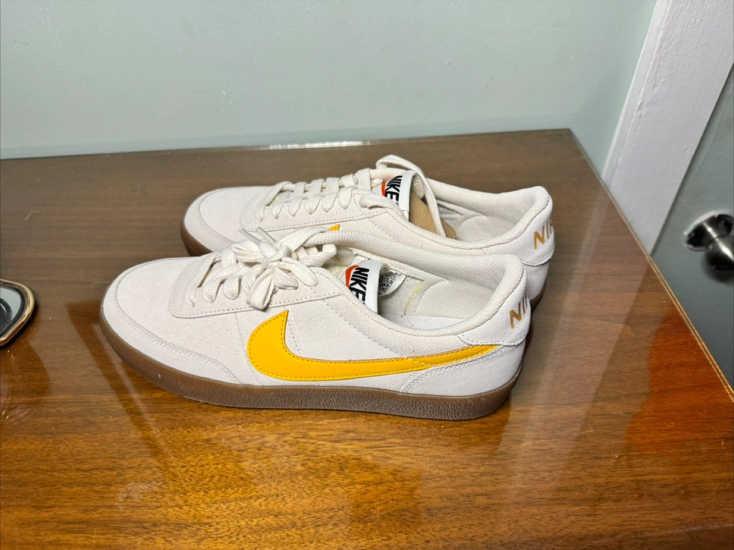 Selling a pair of Nike Killshot shoes in men's size 9. These sneakers feature a classic design with a suede upper and a gum rubber sole. The iconic Nike swoosh is in yellow. They are in never worn new condition and ready for a new home!