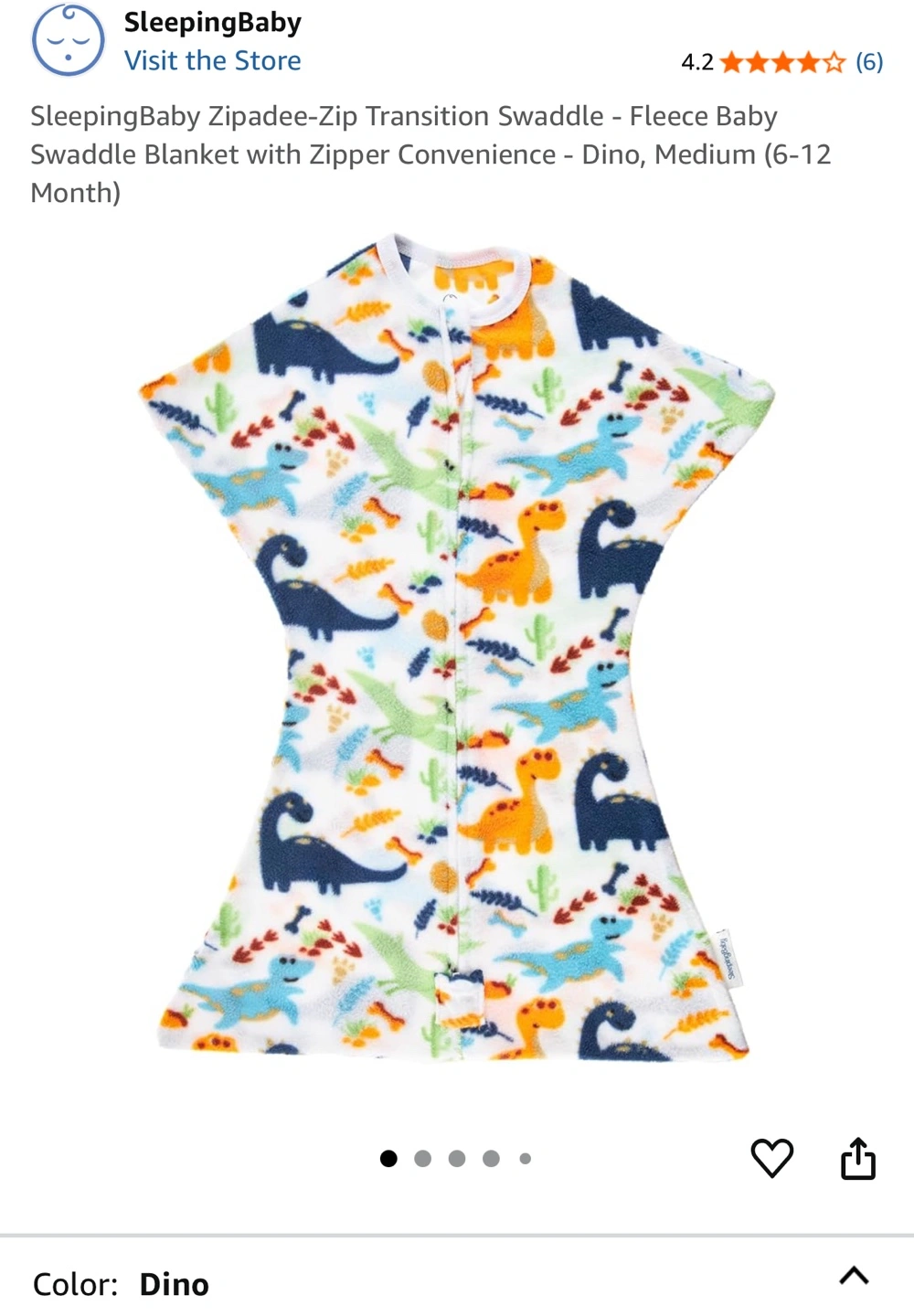 Selling a SleepingBaby Zipadee-Zip Transition Swaddle in the Dino pattern, size Medium (6-12 months). This fleece baby swaddle blanket with zipper convenience is perfect for transitioning your little one. The swaddle is in great condition and ready for a new home!