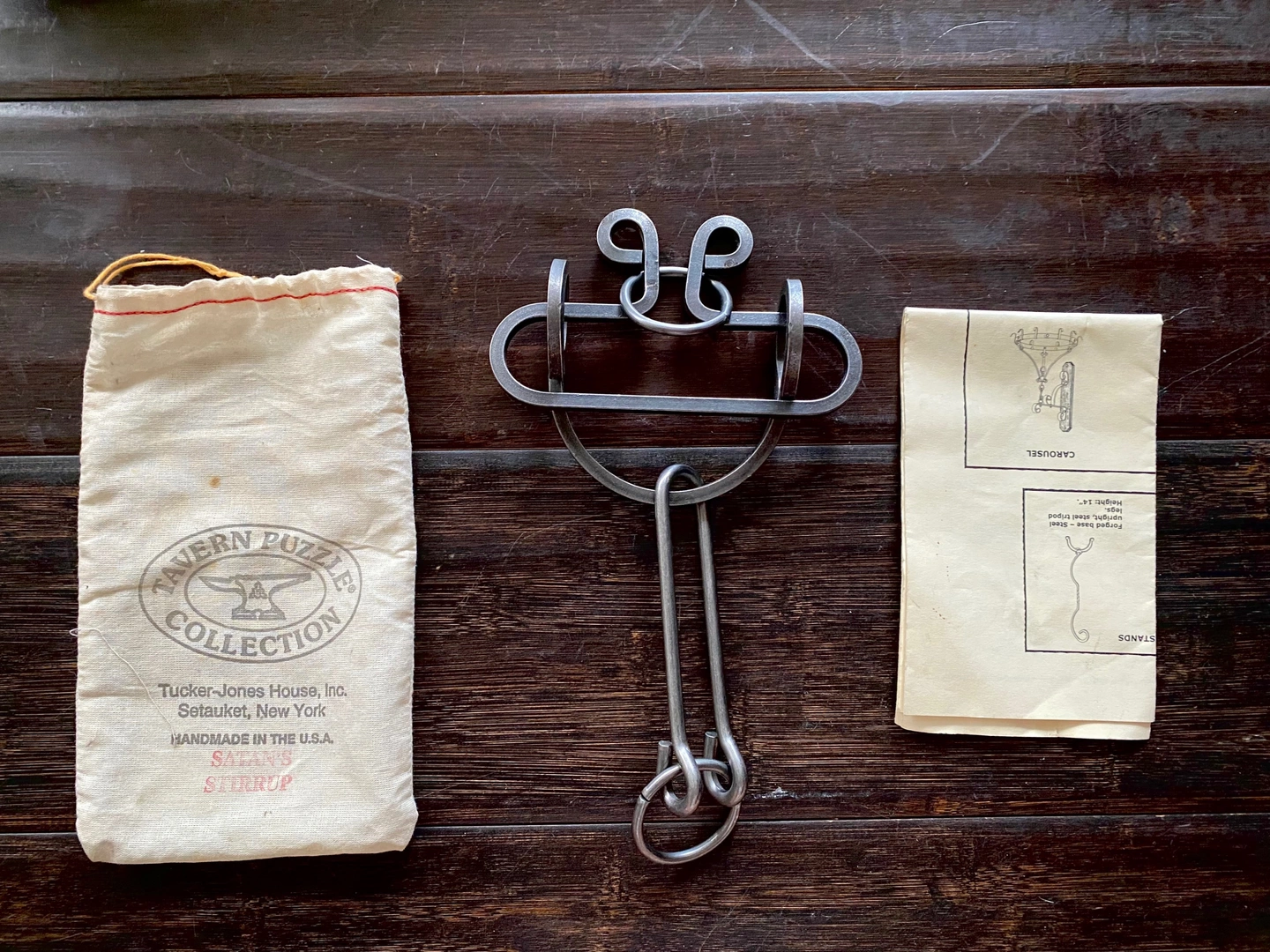 Satan's Stirrup is a DIFFICULT level puzzle - Multi-step sequences; some are combined maneuvers from basic and intermediate categories. Often with close tolerances that require precise movements. Tavern Puzzles® are reproductions of a type of puzzle traditionally forged by blacksmiths to amuse their friends at country taverns and inns. Keeping with tradition, a museum-trained blacksmith from Long Island has reproduced some of these antique designs as well as his own original designs. All the puzzles are handcrafted and individually assembled. Each puzzle is mechanical in nature; removal of the object piece does not rely on force or trickery.