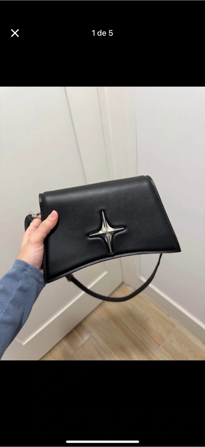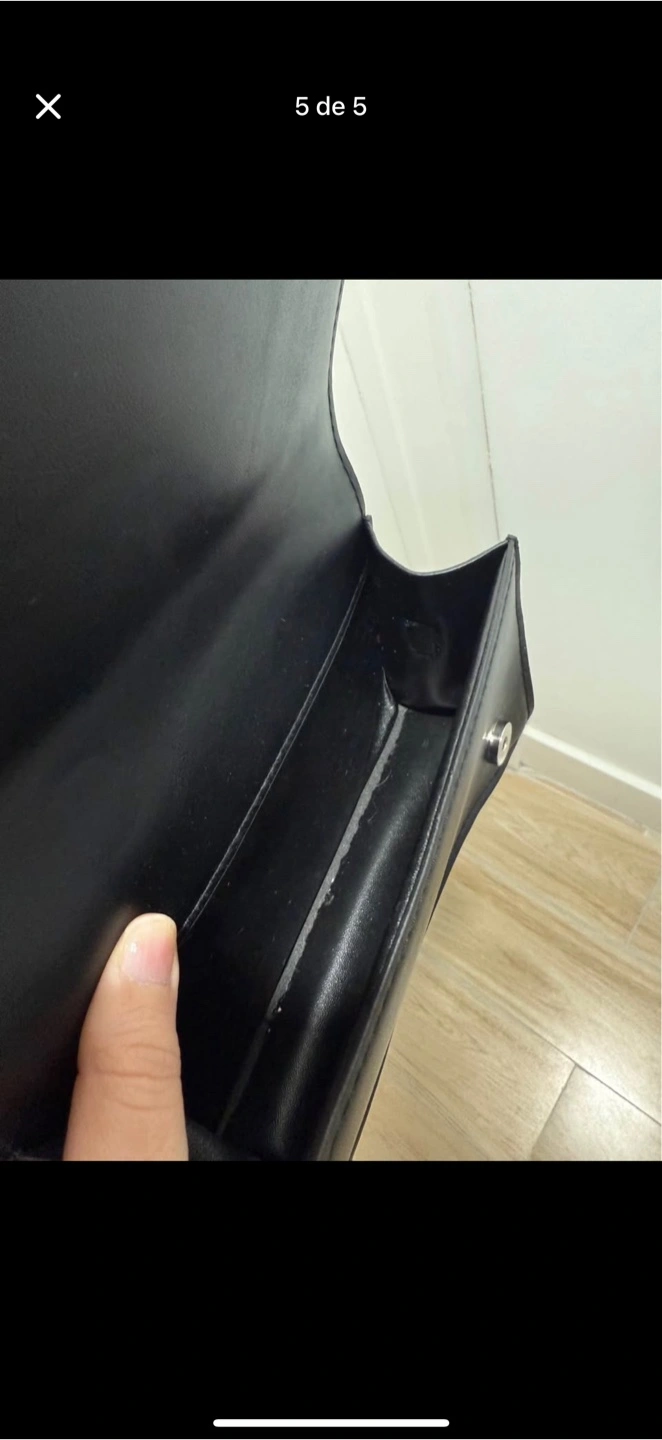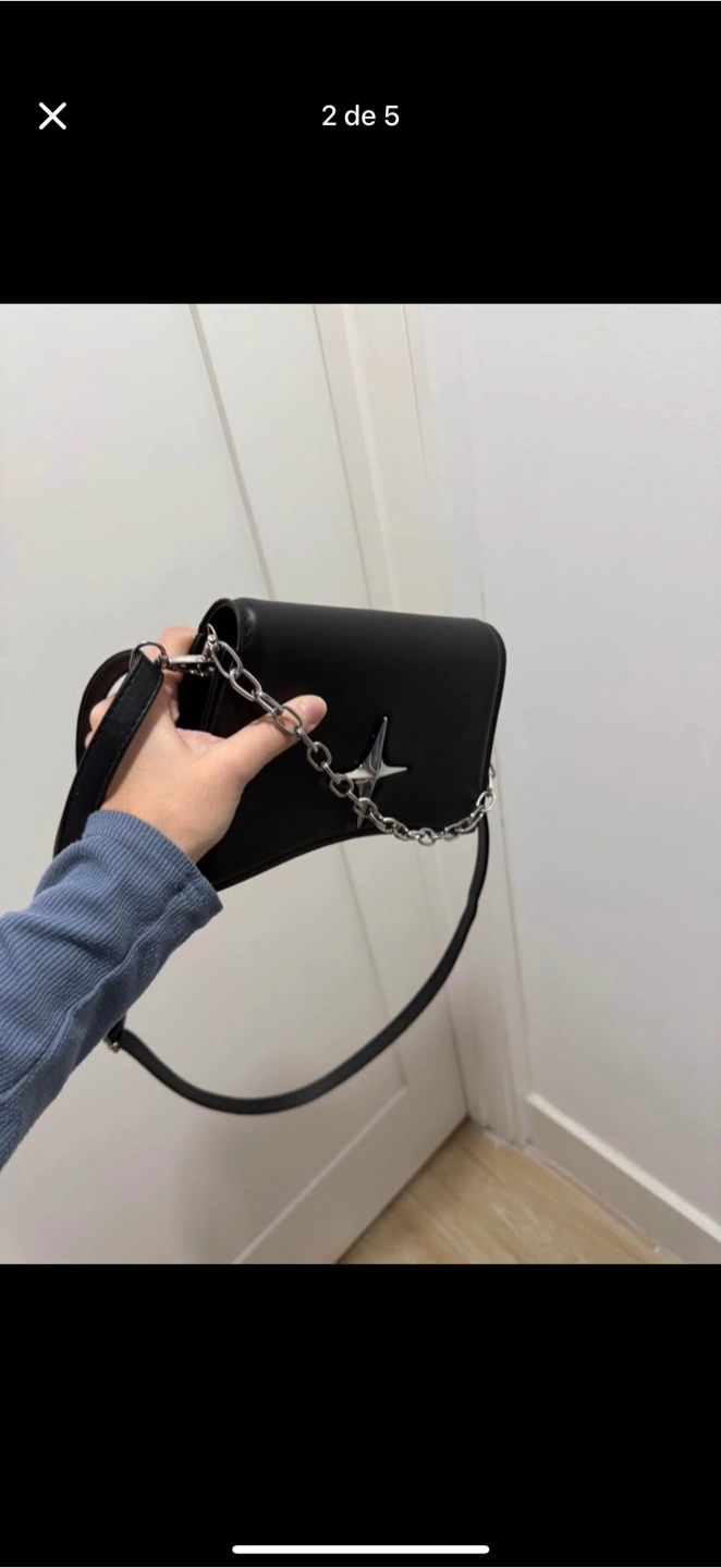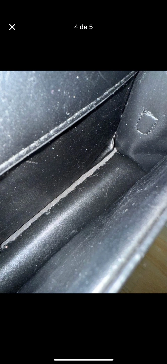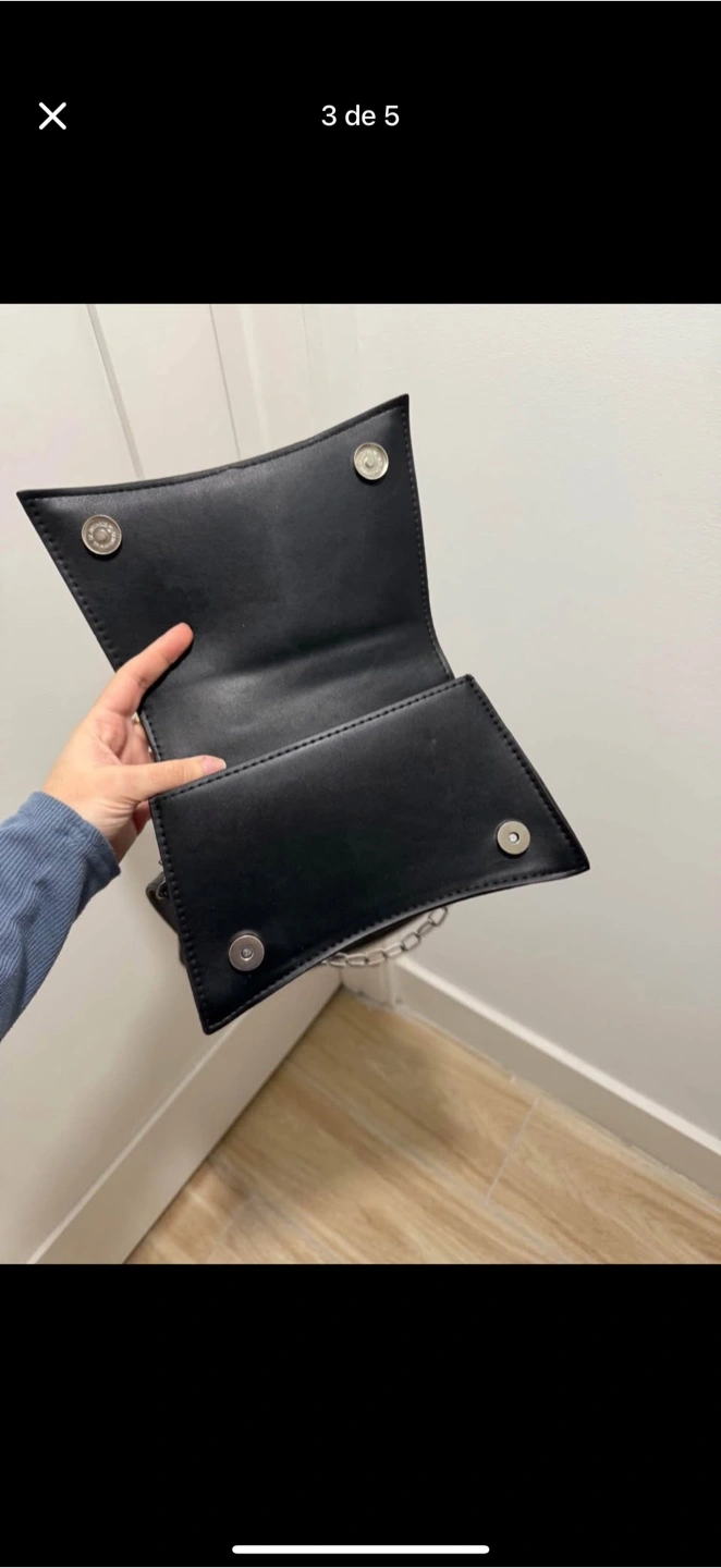 Black and silver shoulder bag. Vegan leather. Has a small failure inside that you can see in the pictures. Is not extremely high quality but it’s functional and fashion. It has a chain strap and is in good condition. It's a stylish and unique accessory to add to your collection