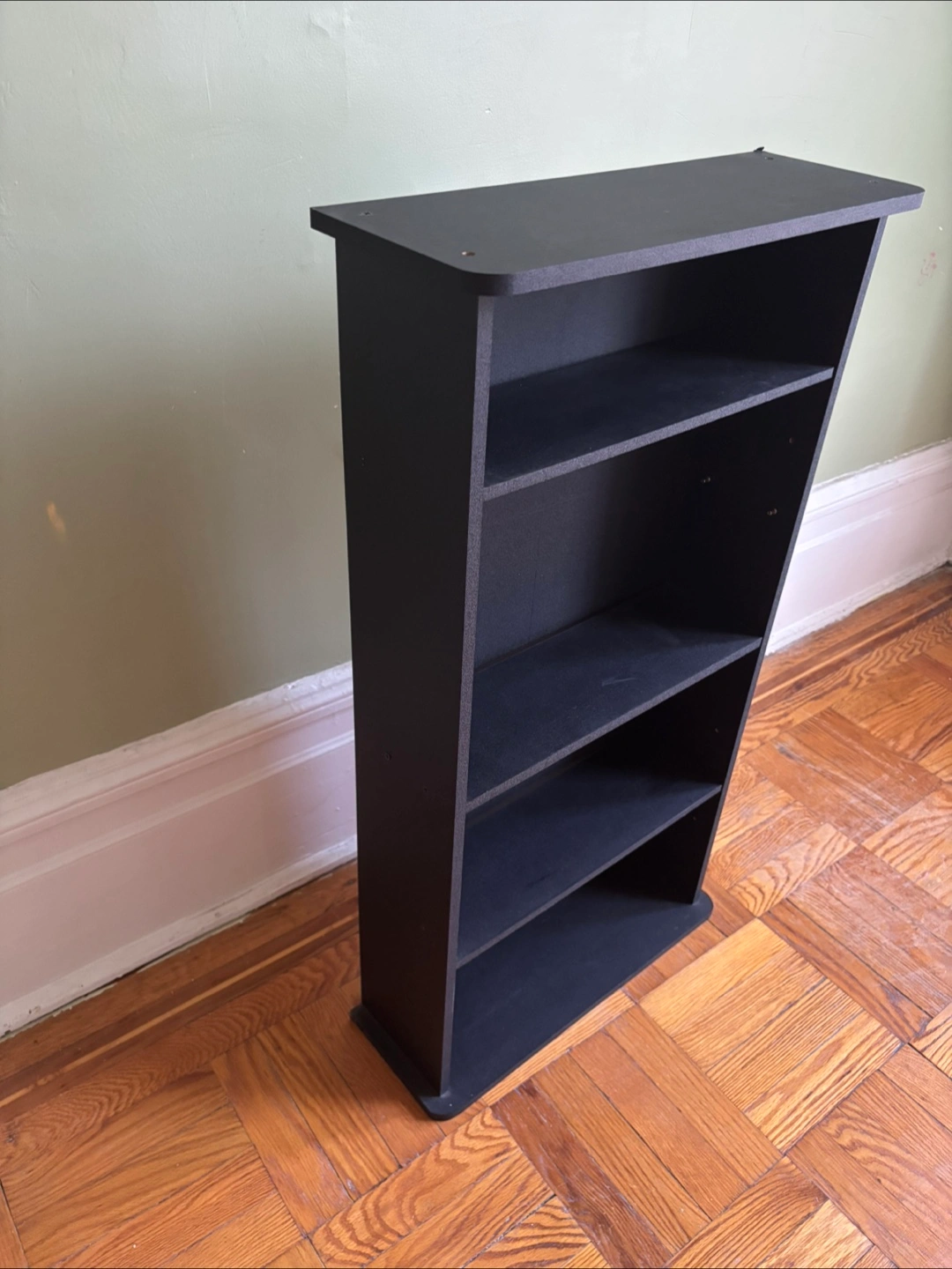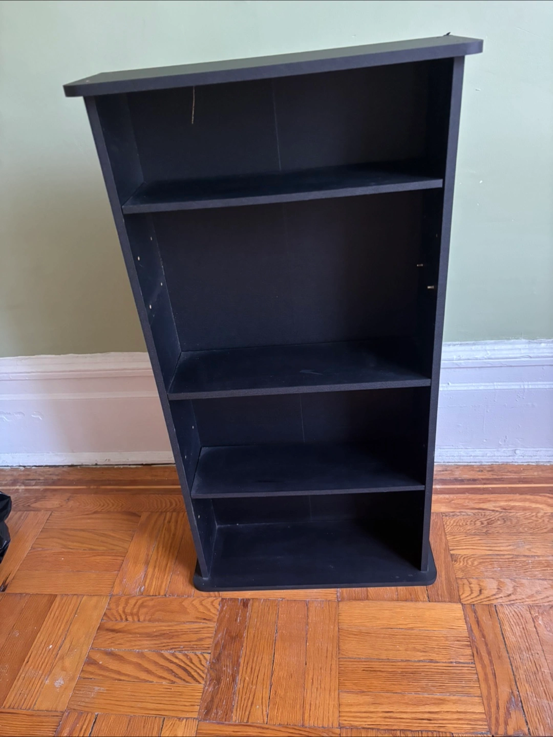 I'm selling a black wooden shelf. It has four shelves for storage or display. Perfect for books, plants, or other decorative items! It's in great condition and ready for a new home