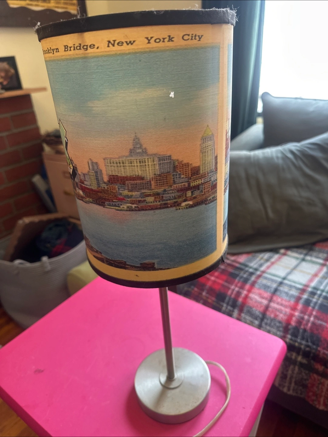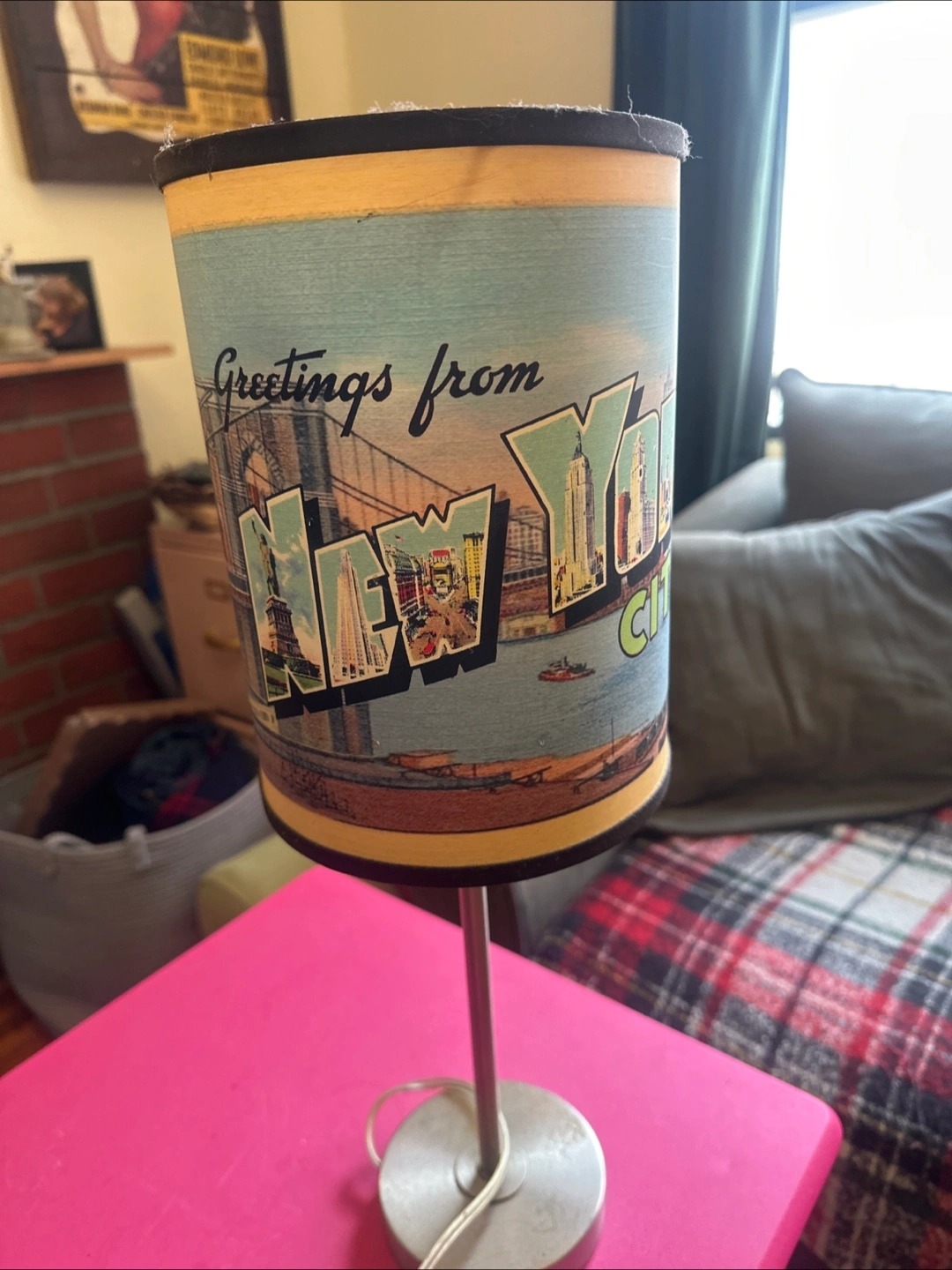 Lamp featuring a design with the Brooklyn Bridge and New York City skyline! The lamp has a cylindrical shade with "Greetings from New York City" printed on it
