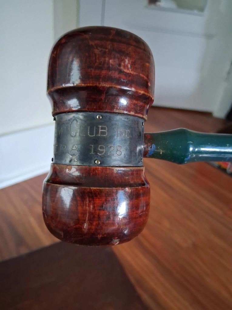 Selling a vintage Kiwanis Club Inc. gavel from 1928. It has a wooden head and a blue handle. A unique piece for collectors or Kiwanis members!