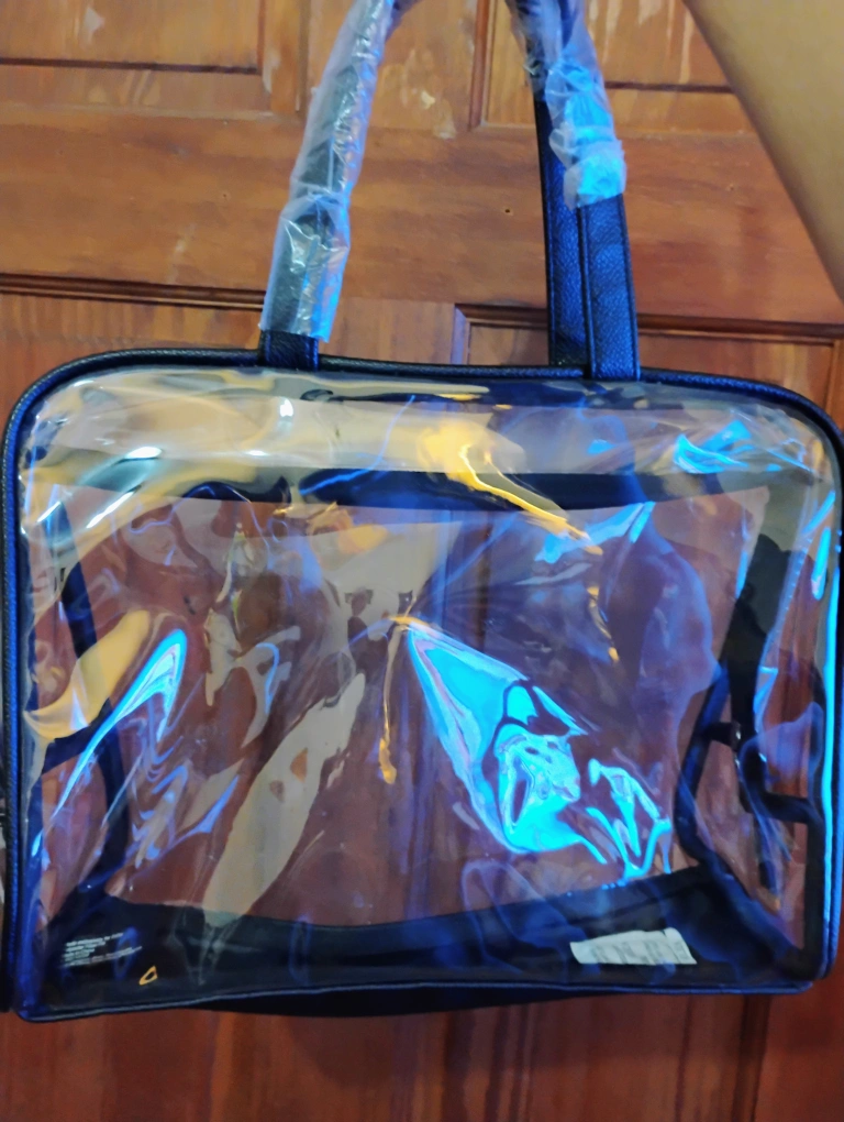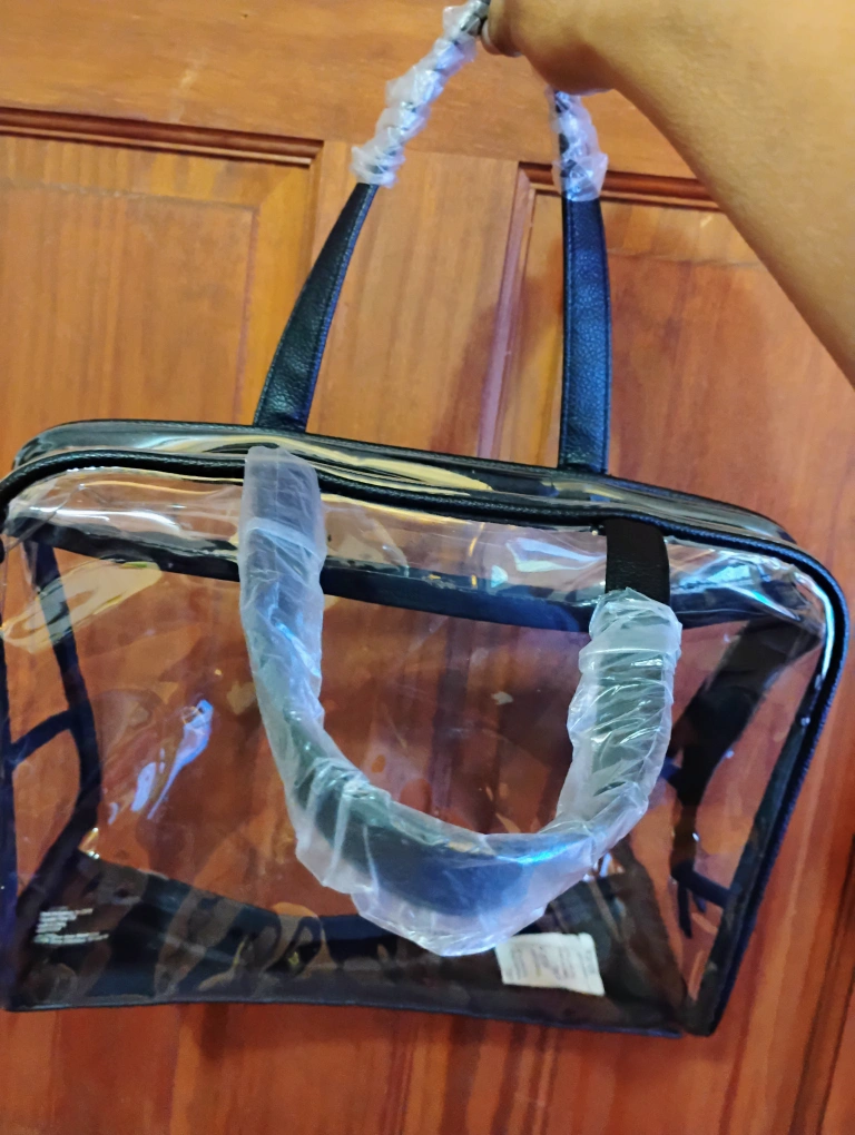 680I'm selling a clear tote bag! It has black handles and trim. It is still in the original packaging.
