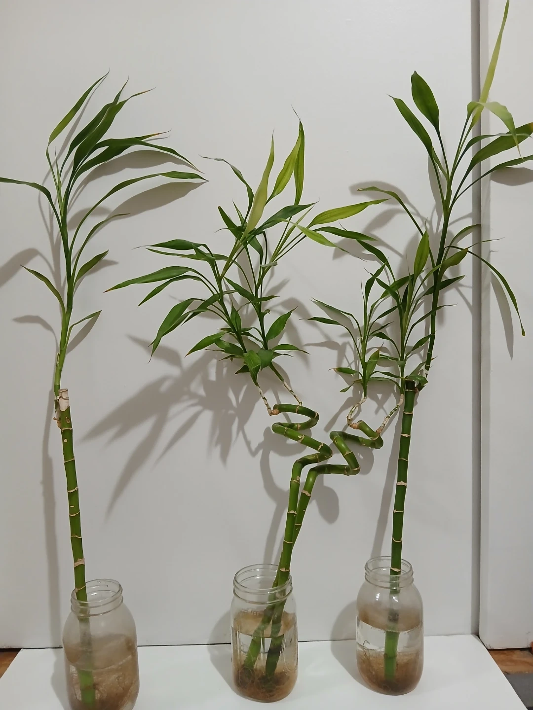 Three lucky bamboo plants in glass jars. Includes a straight stalk, a twisted stalk, and another straight stalk. They're rooted in water and ready for a new home 20$ each jar