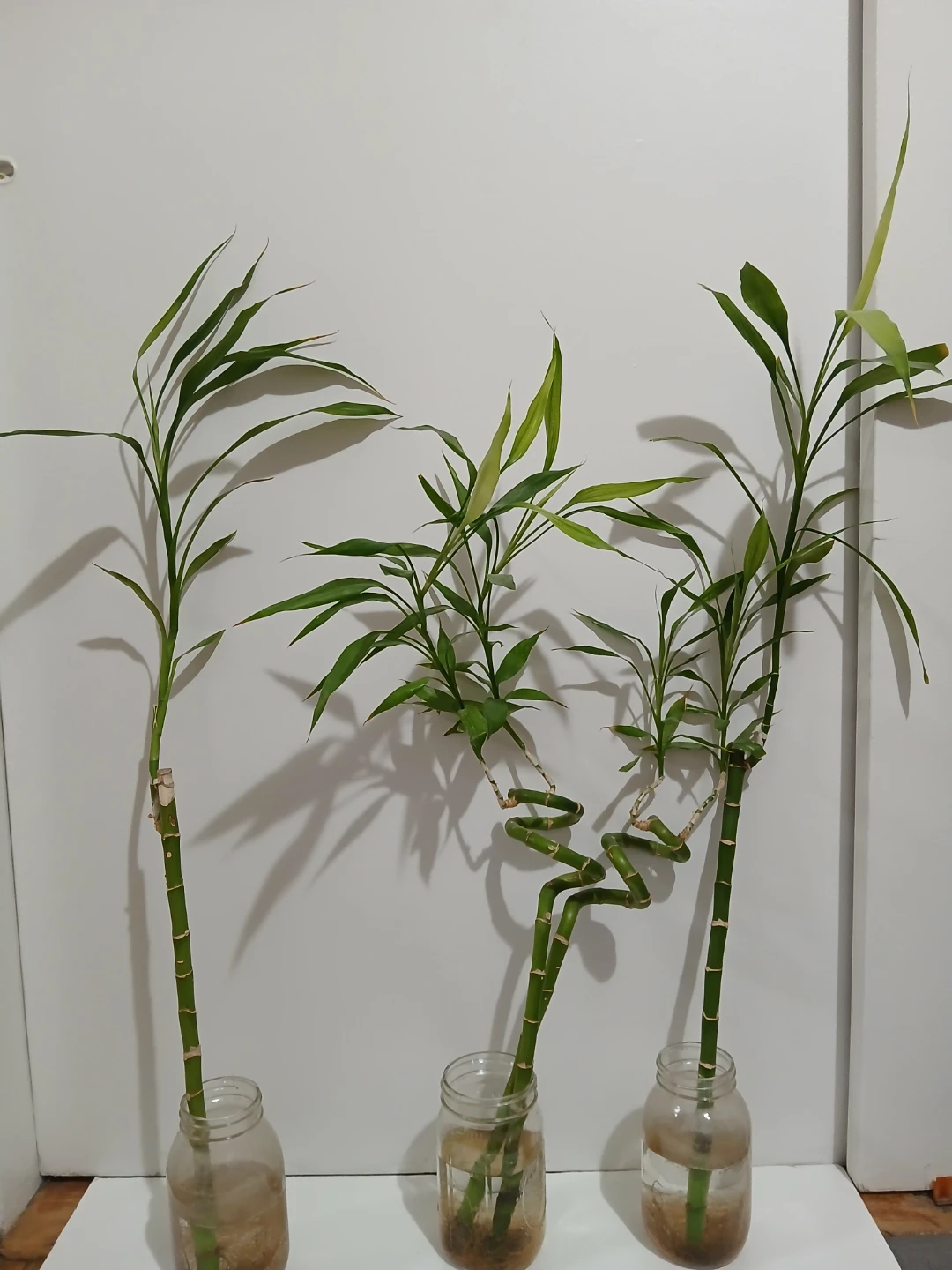 Three lucky bamboo plants in glass jars. Includes a straight stalk, a twisted stalk, and another straight stalk. They're rooted in water and ready for a new home 20$ each jar
