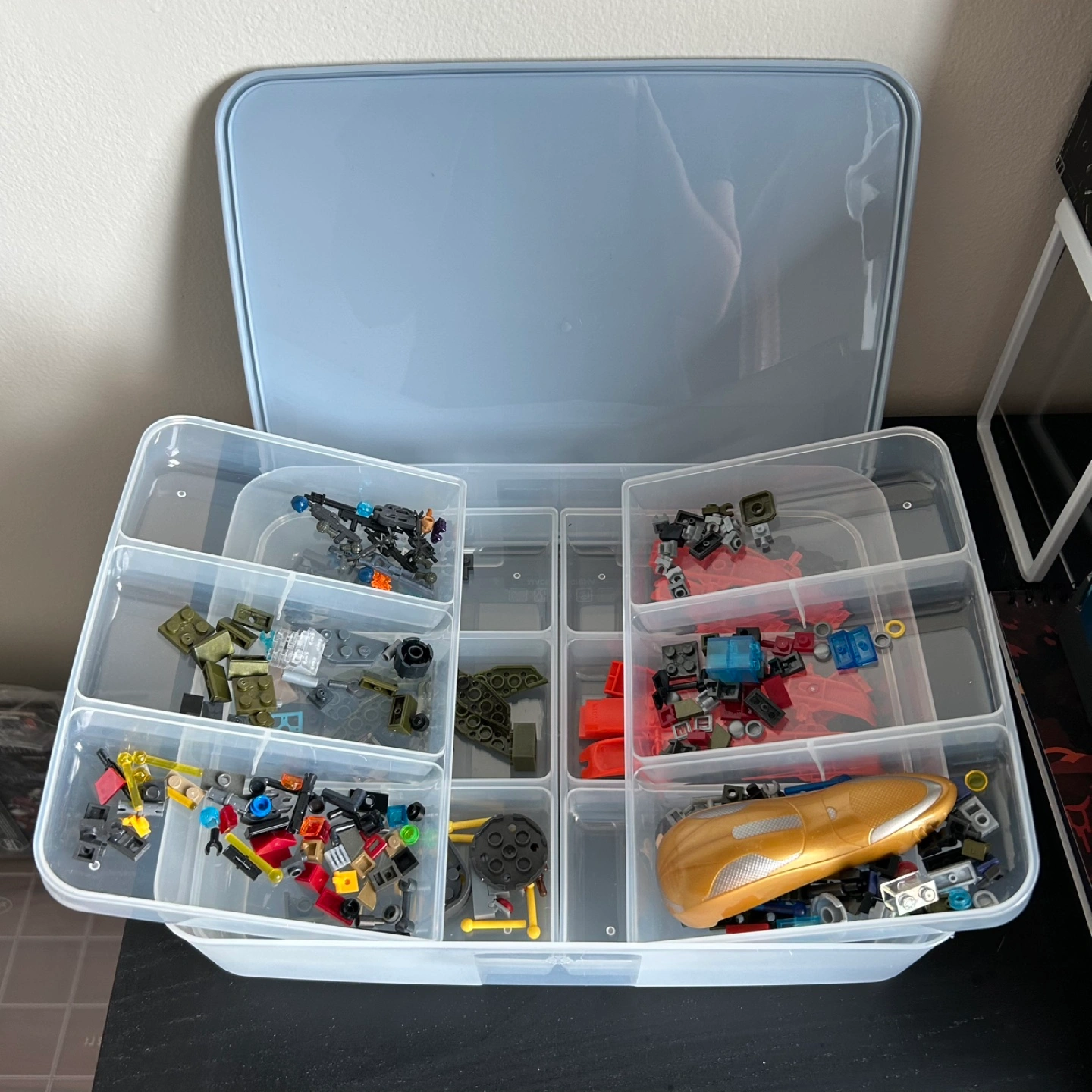 Two layer plastic storage box with dividers to keep your items organized! It's in great shape and ready to help you tidy up your space