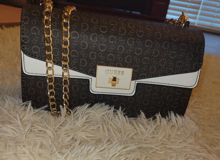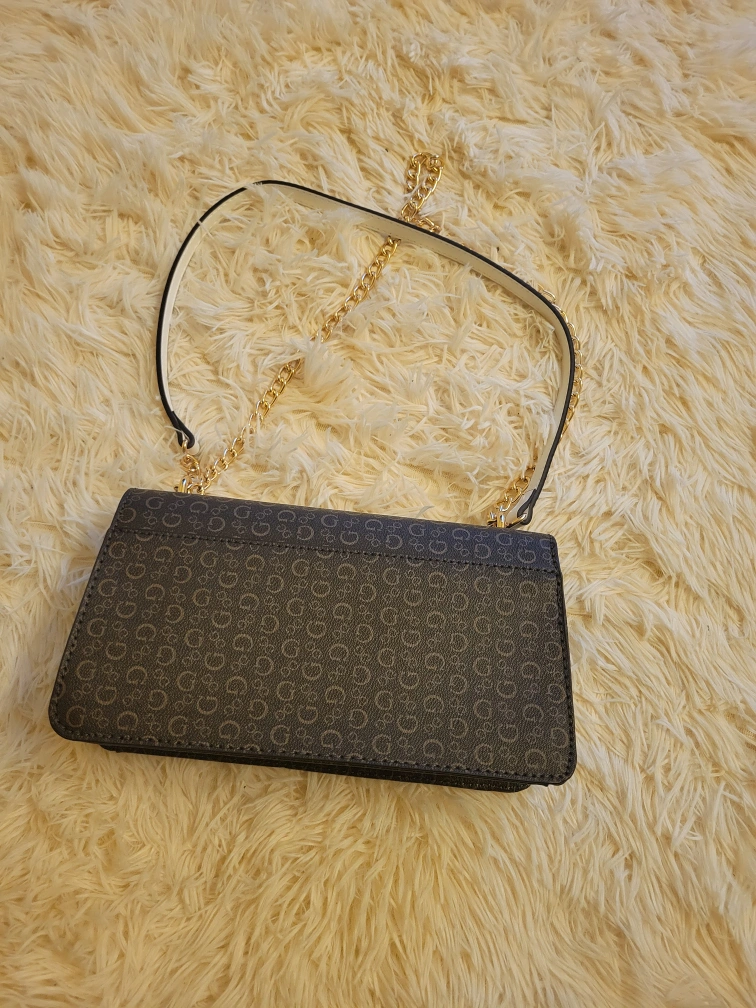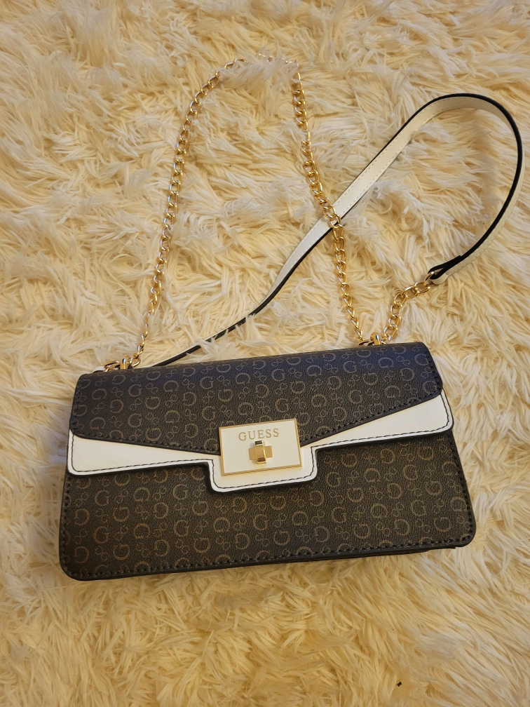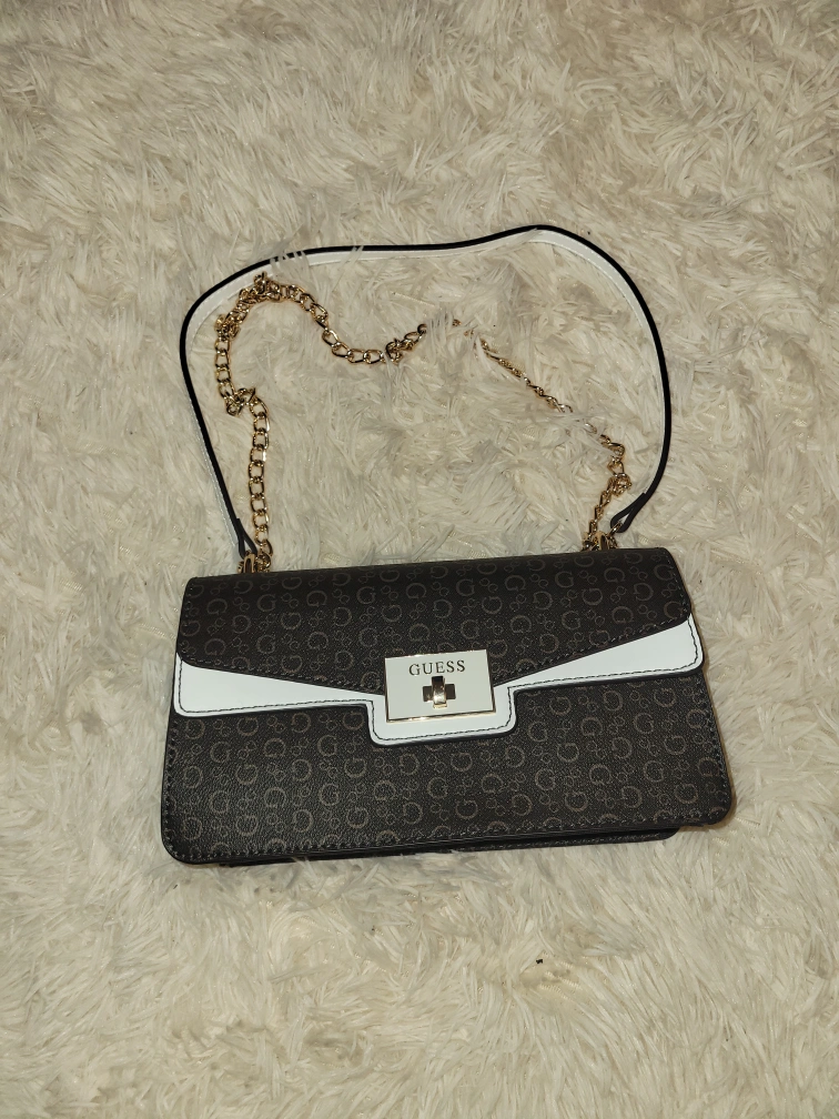Selling a Guess crossbody bag with a brown and white patterned design. It features a gold chain strap and the Guess logo on the front. It's in great condition and ready for a new home!