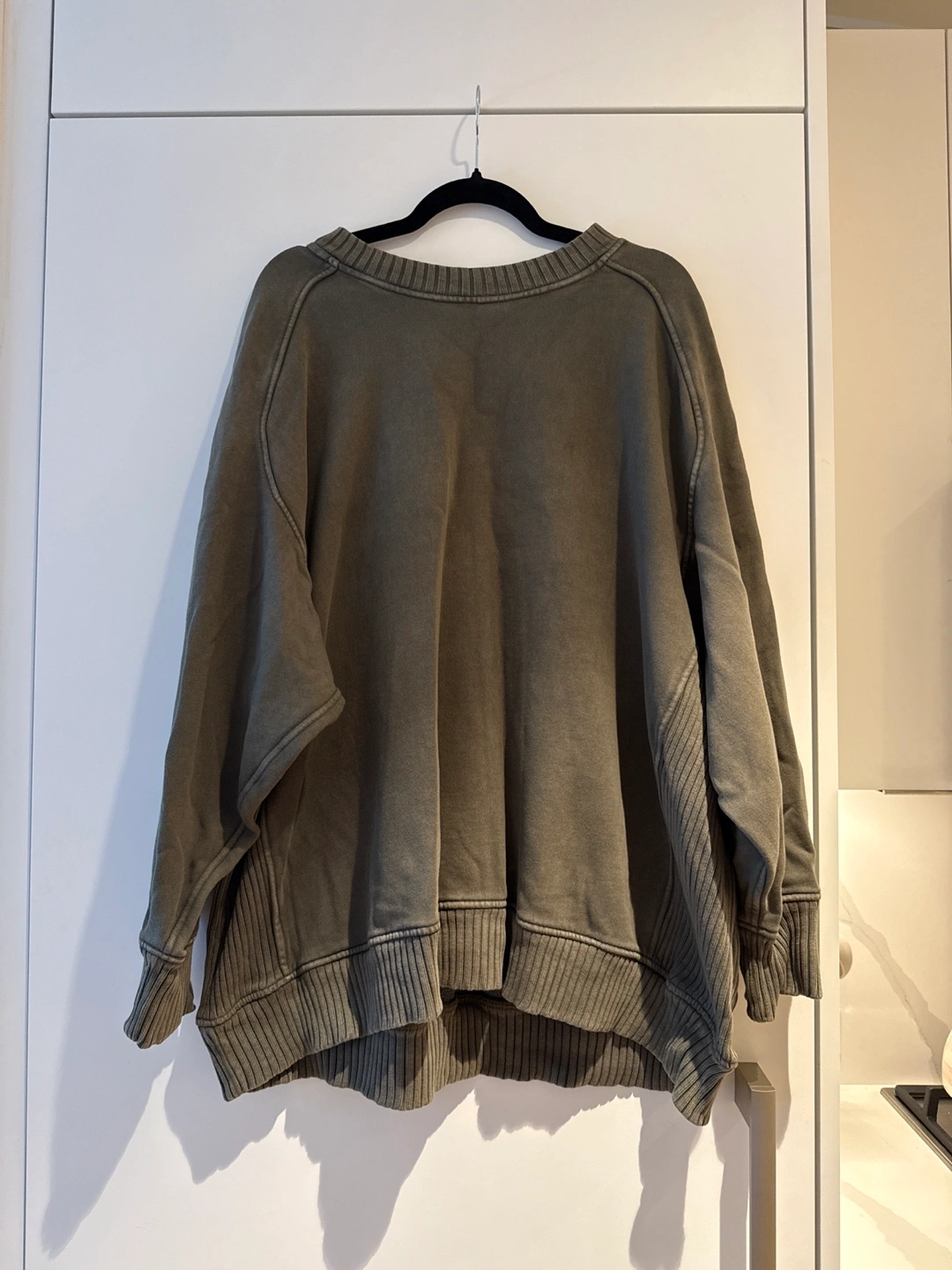 Here's a comfy oversized sweatshirt in a nice olive green color! It has a relaxed fit and a unique ribbed hem and cuffs. Perfect for lounging or casual outings