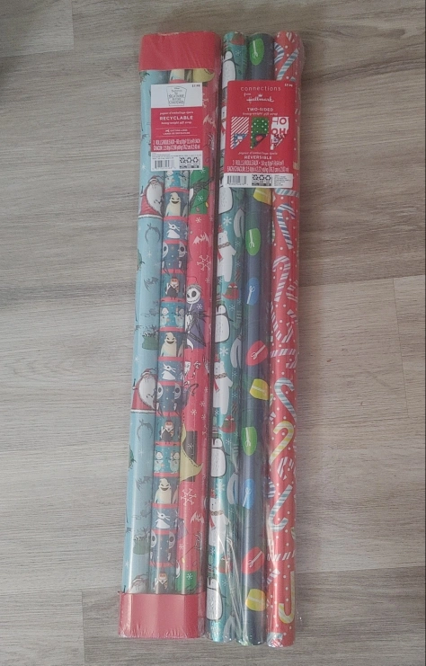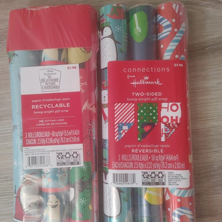 One is from Hallmark's 'Connections' line, featuring two-sided, heavy-weight paper. It includes 3 rolls, each 50 sq ft (2.22 ft x 2.03 m).