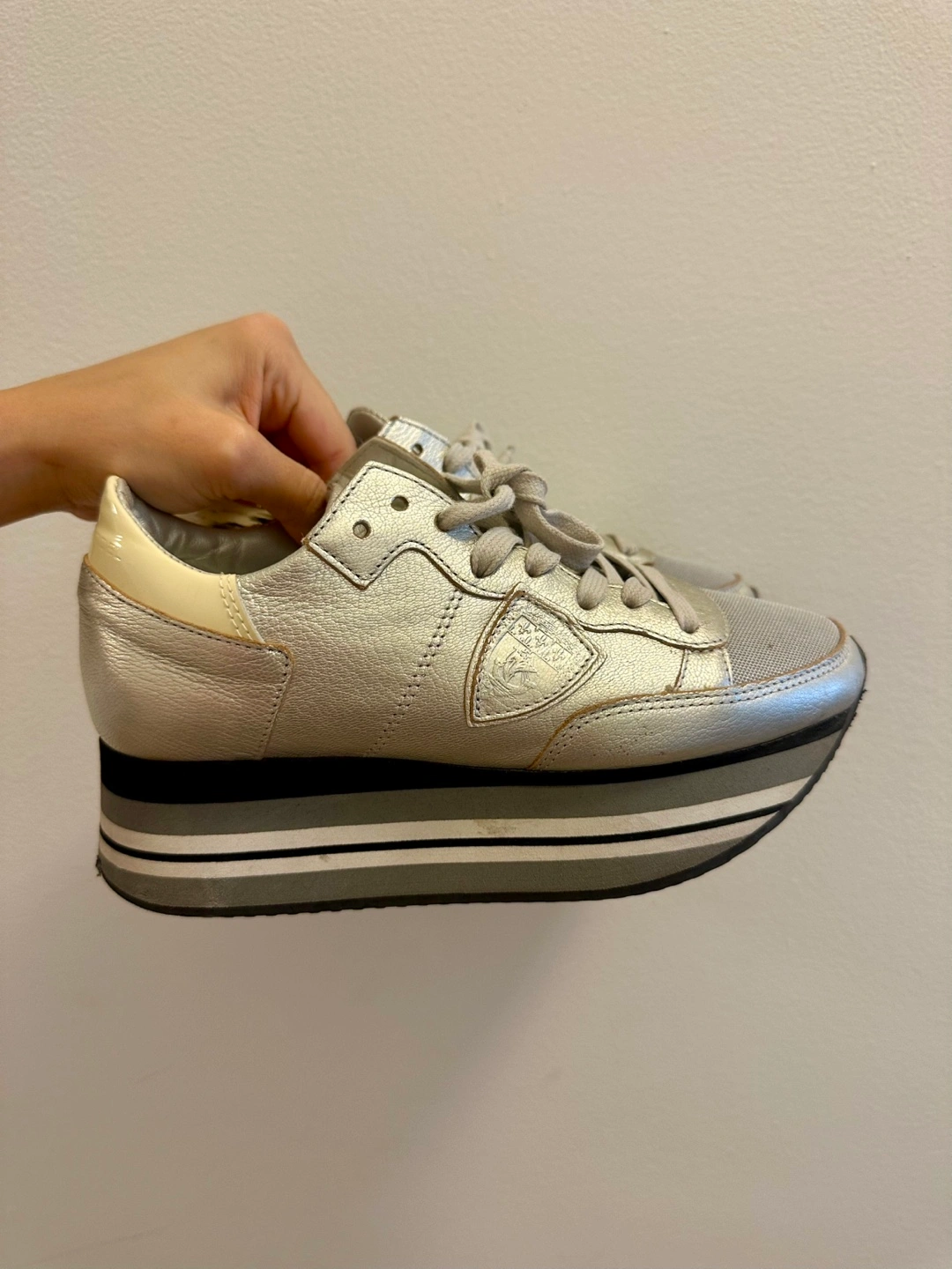 Selling a pair of Philippe Model Paris sneakers in silver. These are a size 36 and have a stylish platform sole. They are in good condition and ready for a new home!