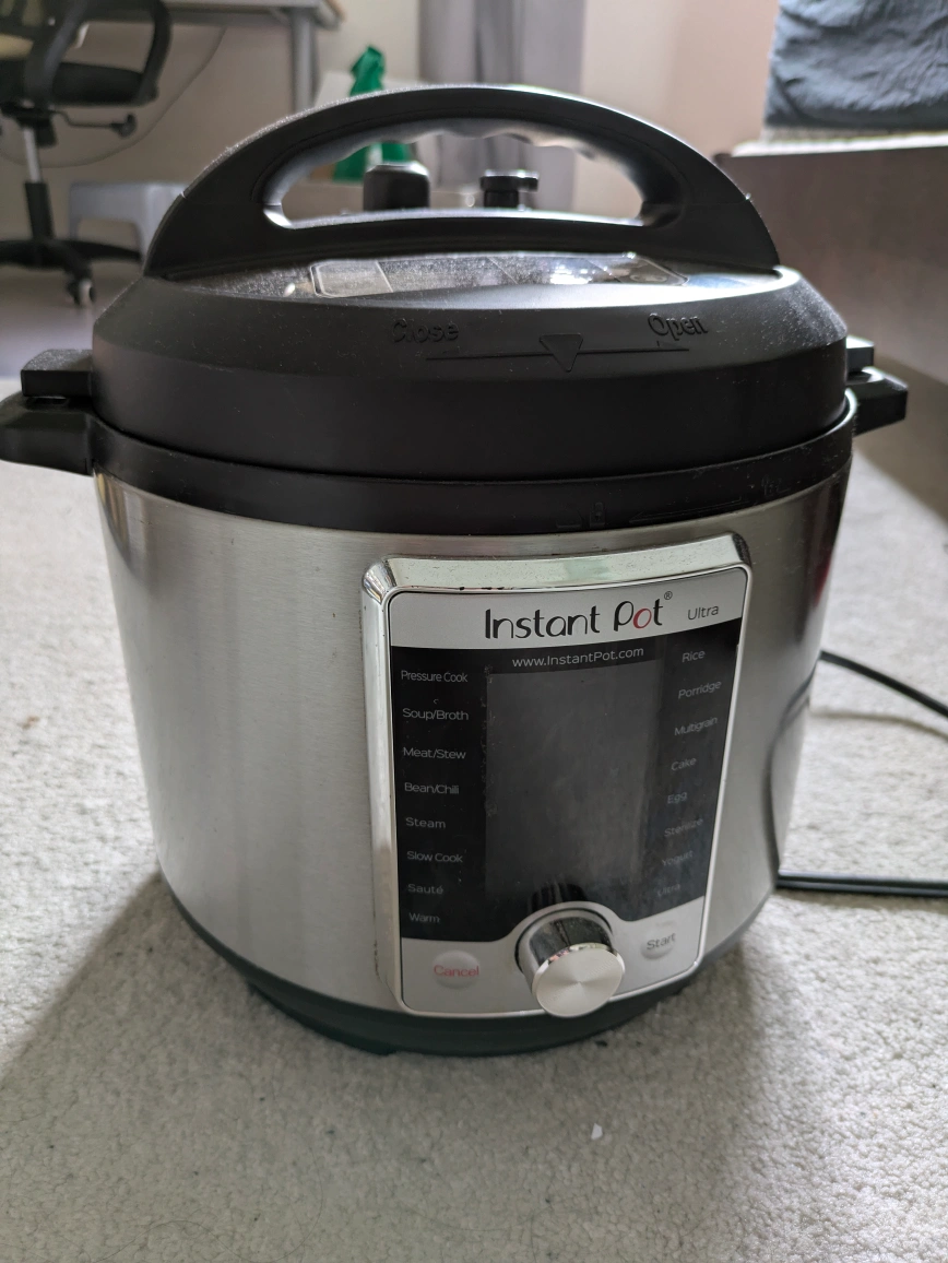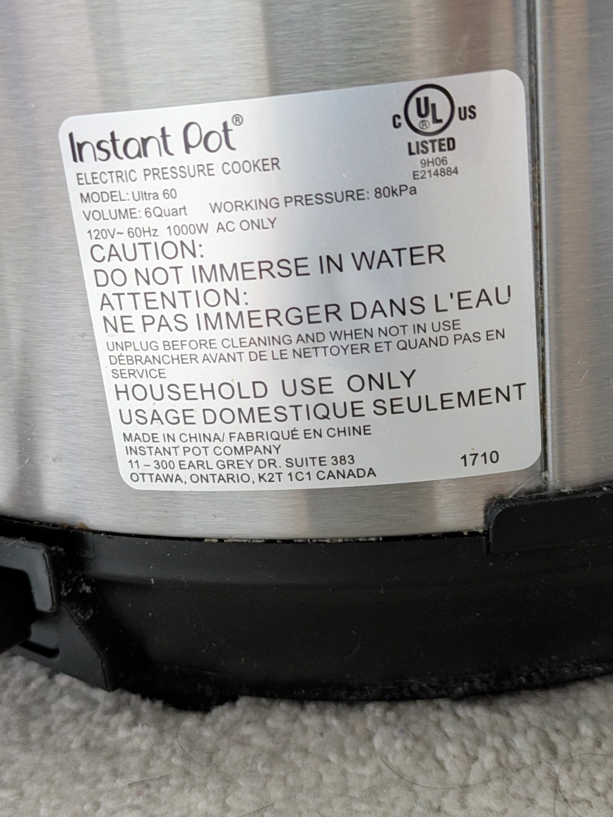 Selling a used Instant Pot Ultra 60 electric pressure cooker. It has a 6-quart volume and a working pressure of 80kPa. Perfect for cooking a variety of meals!