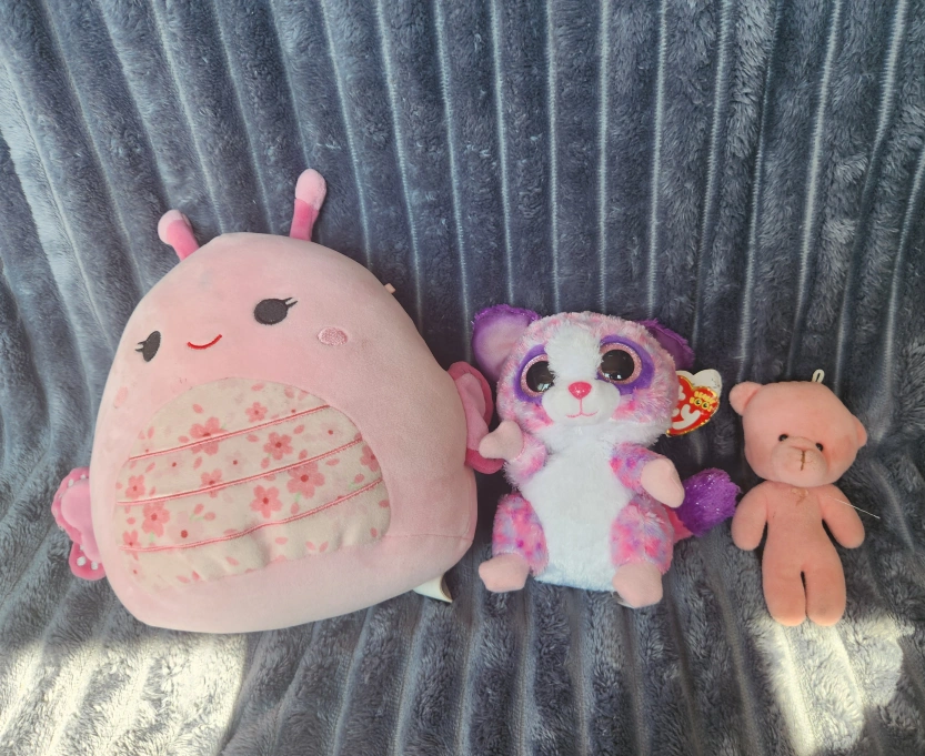 50Selling a bundle of three cute plush toys! There's a pink Squishmallow with a floral pattern, a purple and white Beanie Boo, and a small pink teddy bear. They're all in good condition and ready for a new home!