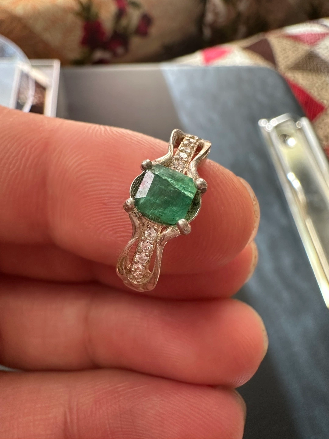 Selling a beautiful emerald and diamond ring! It features a square-cut emerald surrounded by smaller diamonds set in a silver band. It's in great condition and ready for a new owner