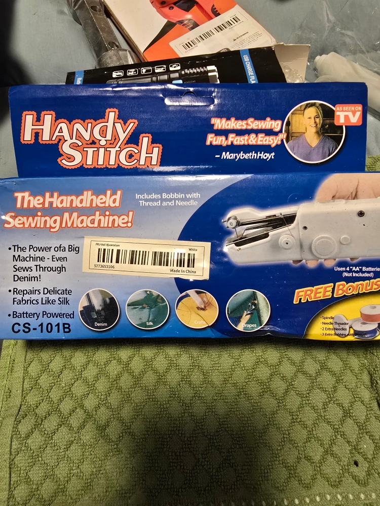 Selling a Handy Stitch handheld sewing machine! It's battery powered and can even sew through denim. It also includes a bobbin with thread and needle. It can repair delicate fabrics like silk. Comes with a free bonus: spindle, needle threader, 2 extra needles, and 3 extra bobbins with thread