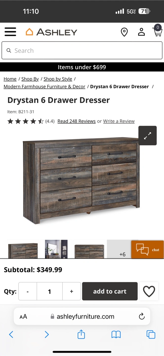 Selling an Ashley Drystan 6 Drawer Dresser in great condition! It has a rustic, modern farmhouse style that would look great in any bedroom. This dresser features six spacious drawers for ample storage. Originally paid 400. Bit chip on a leg but not noticeable. A lot space to share. Dimensions: 59"W x 15.31"D x 36.5"H. Drawer Interior (6)