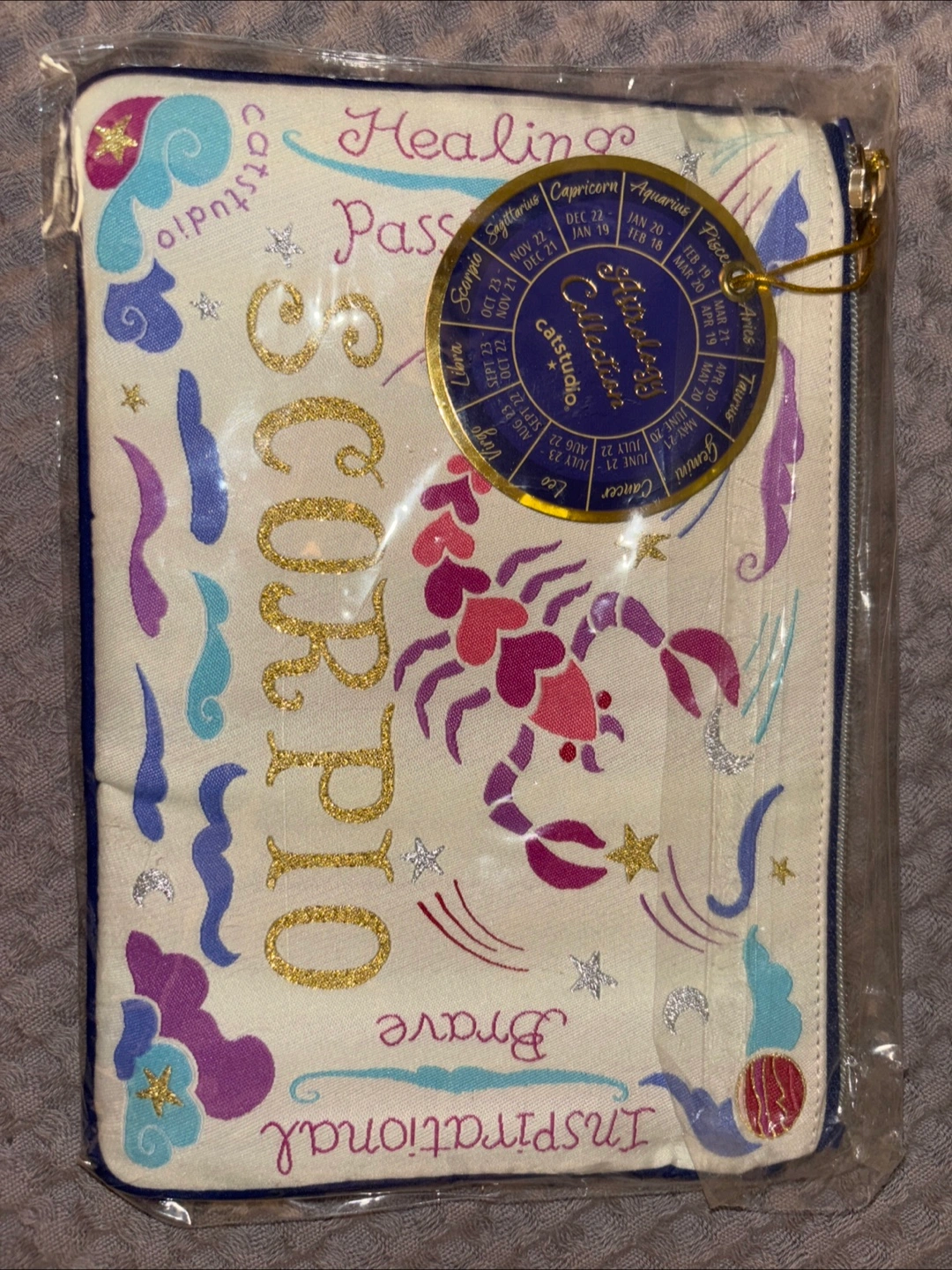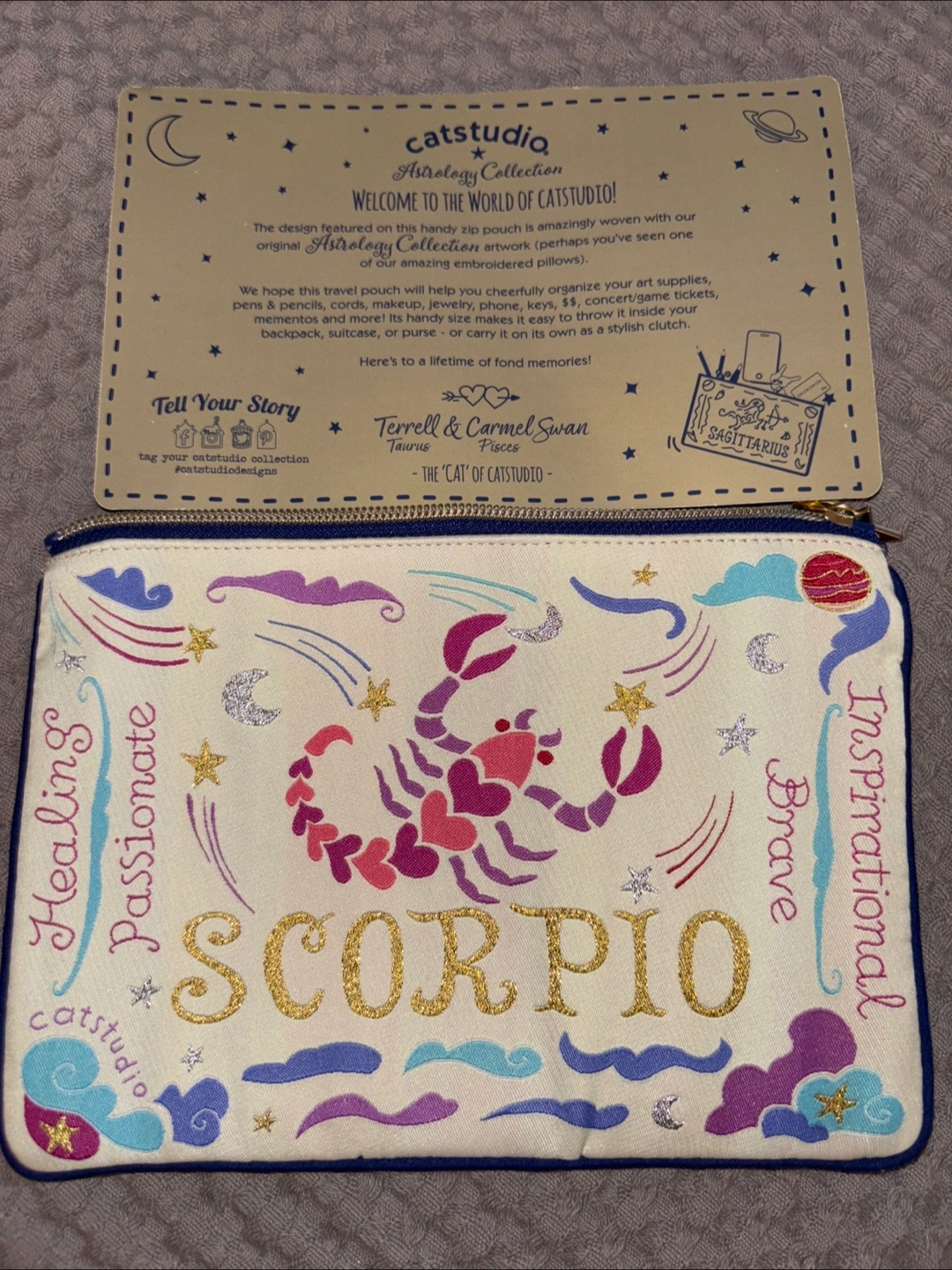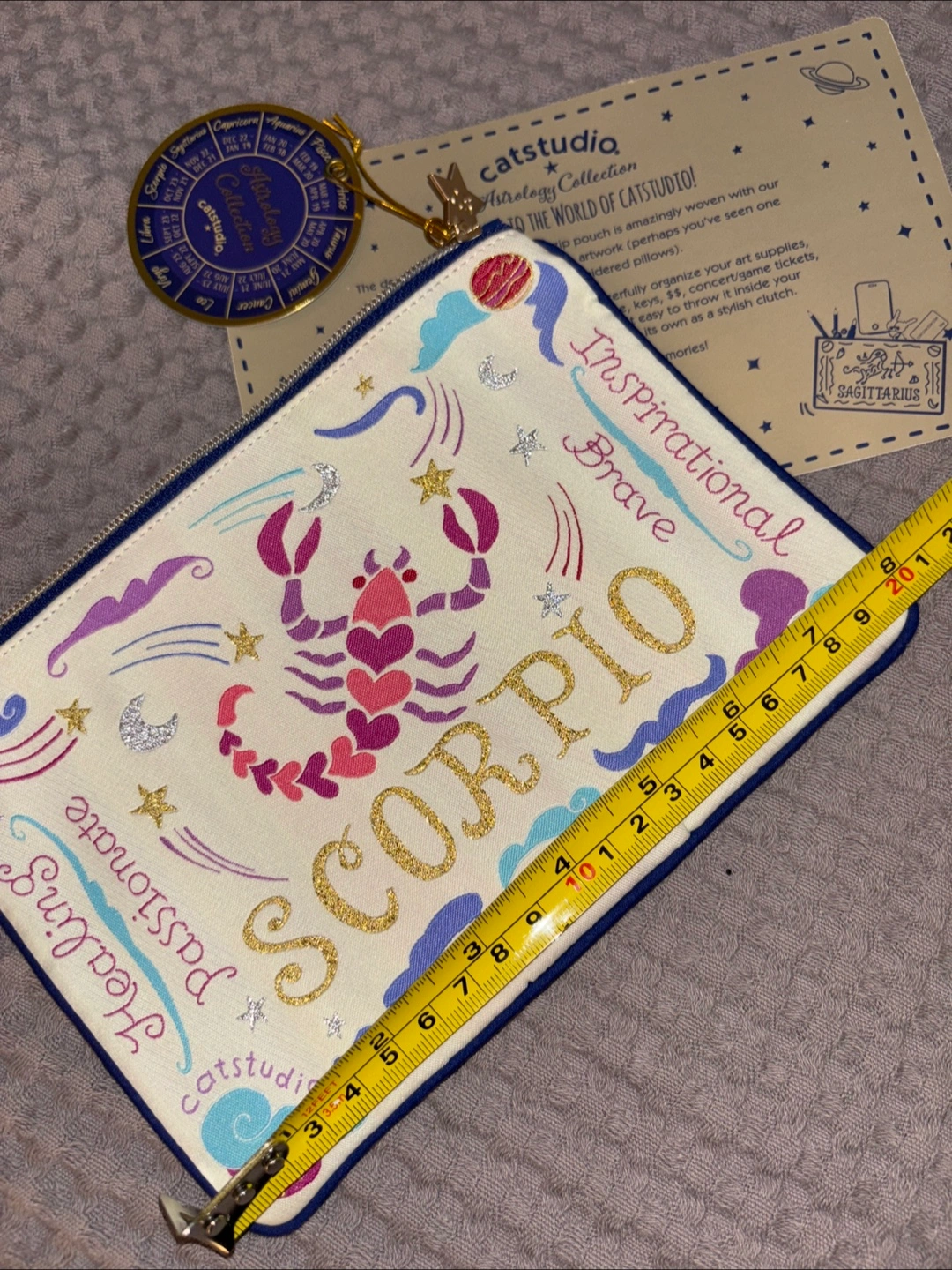 Catstudio Astrology Collection zip pouch featuring the Scorpio design! It's perfect for travels, organizing your art supplies, pens, pencils, cords, makeup, jewelry, phone, keys, or even concert/game tickets. Throw it inside your backpack, suitcase, or purse, or carry it on its own as a stylish clutch! Brand new still in wrapping. Never used.