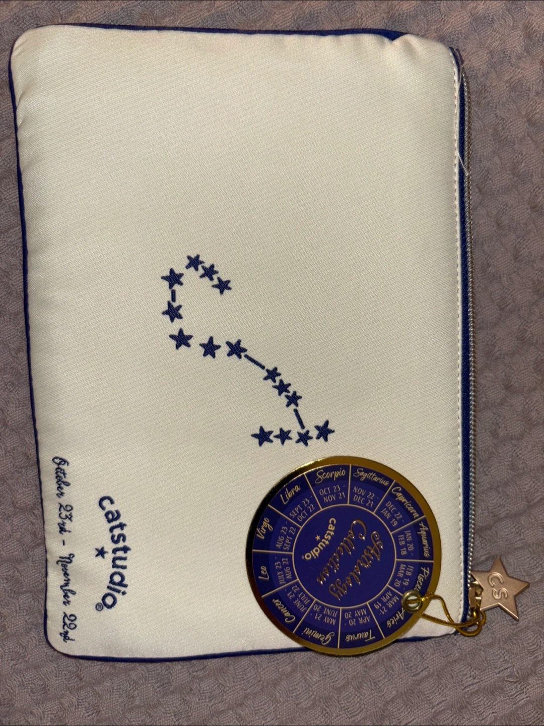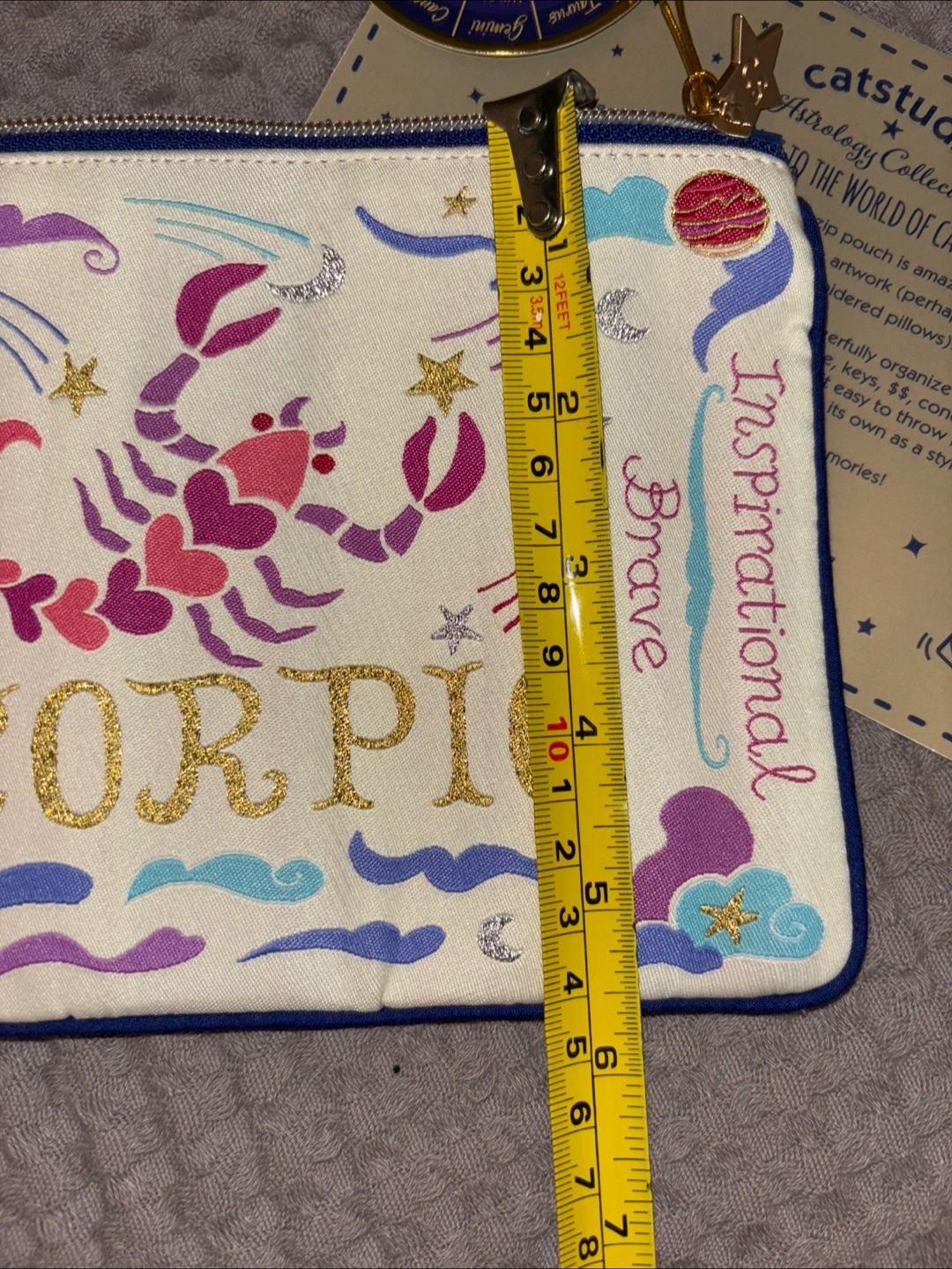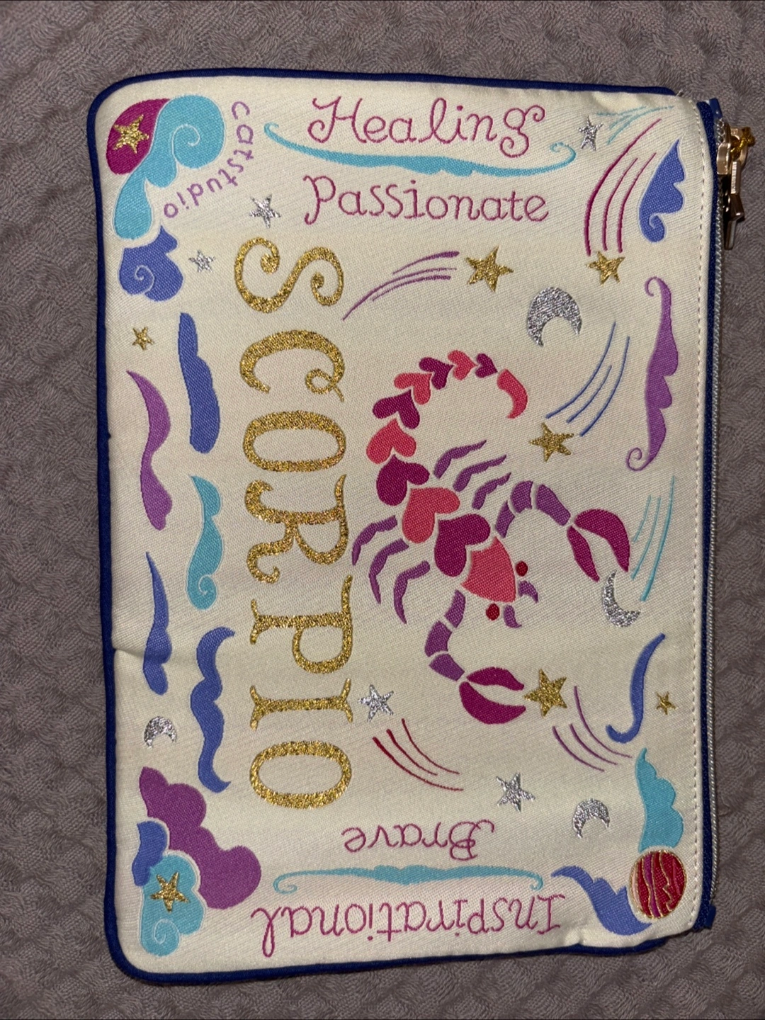 Catstudio Astrology Collection zip pouch featuring the Scorpio design! It's perfect for travels, organizing your art supplies, pens, pencils, cords, makeup, jewelry, phone, keys, or even concert/game tickets. Throw it inside your backpack, suitcase, or purse, or carry it on its own as a stylish clutch! Brand new still in wrapping. Never used.