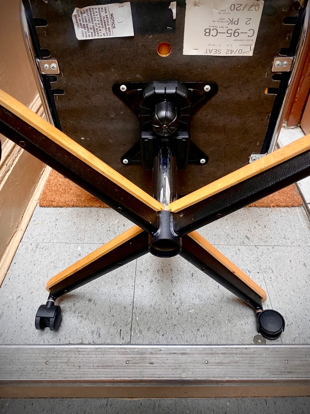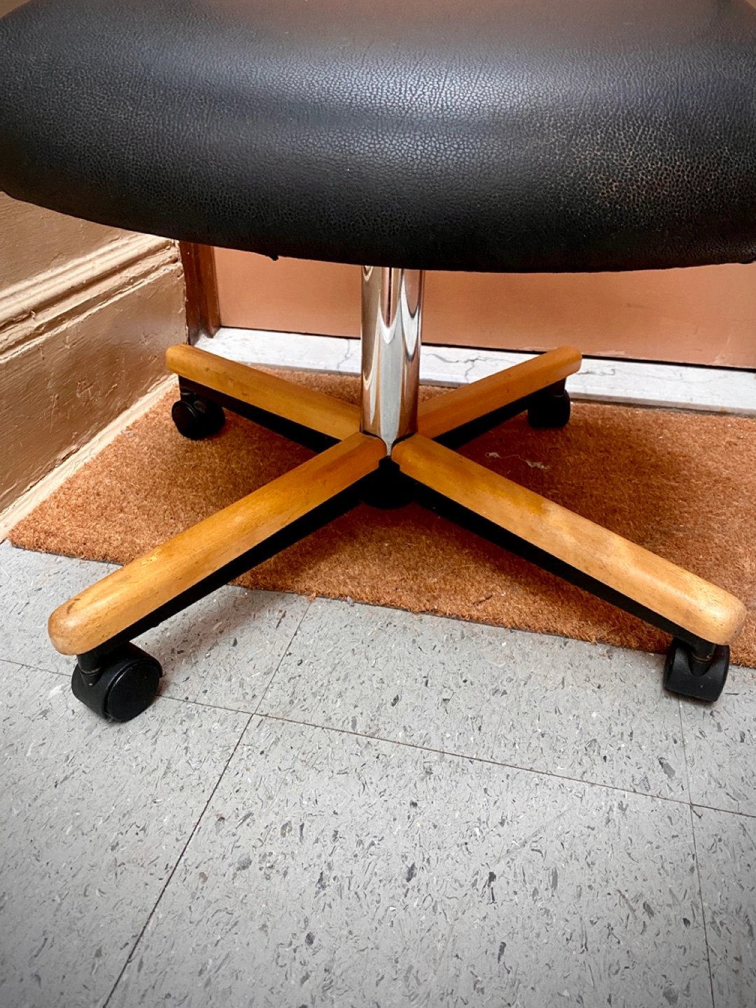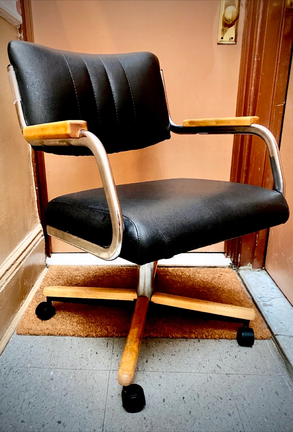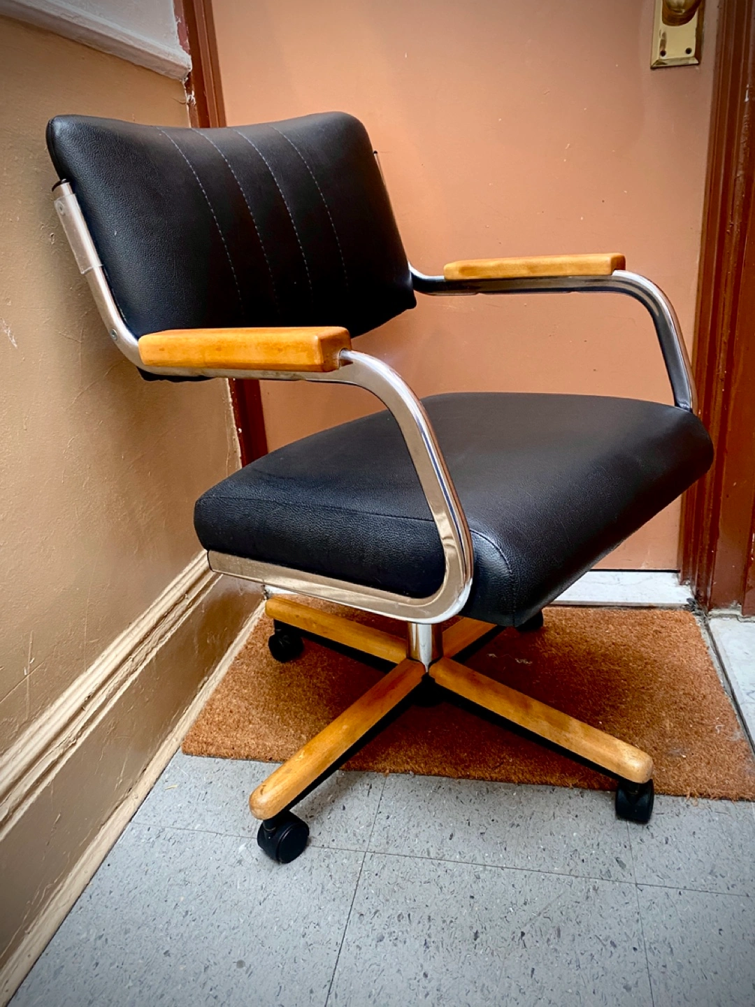 Selling a black leather Chromcraft swivel chair with a wooden base and armrests. It features a chrome frame and a sleek comfortable design. Perfect for a home office or study space! Gorgeous midcentury design. Pickup on Astoria Blvd South and 37th Street.