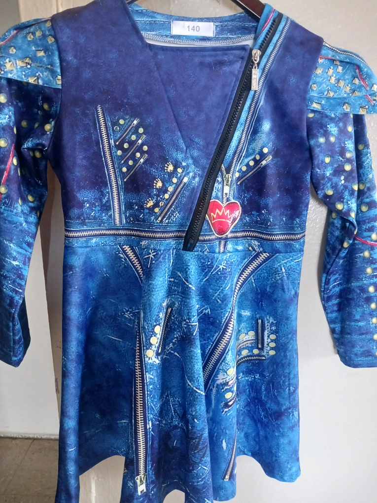 Here's a cute blue patterned dress in size 140! It has a unique design with zipper and heart details. Perfect for a fun and stylish look!