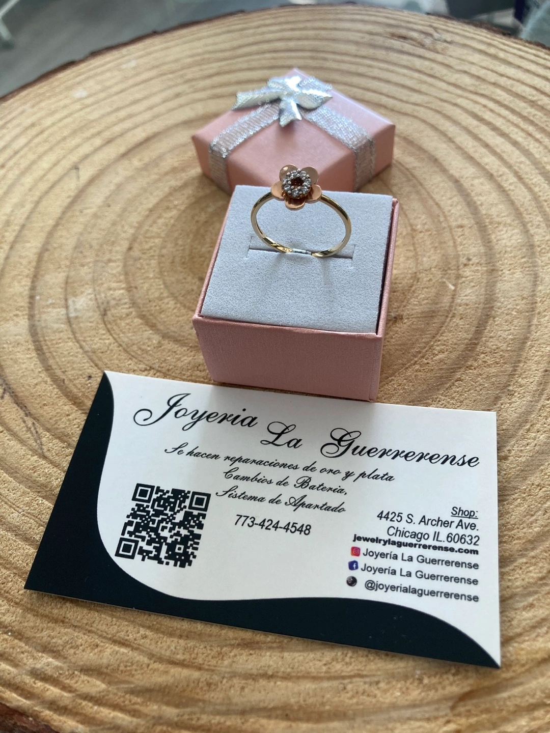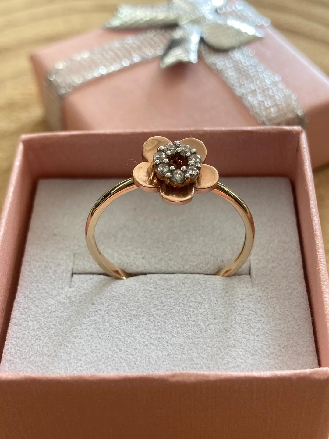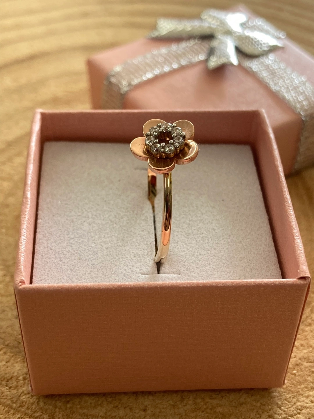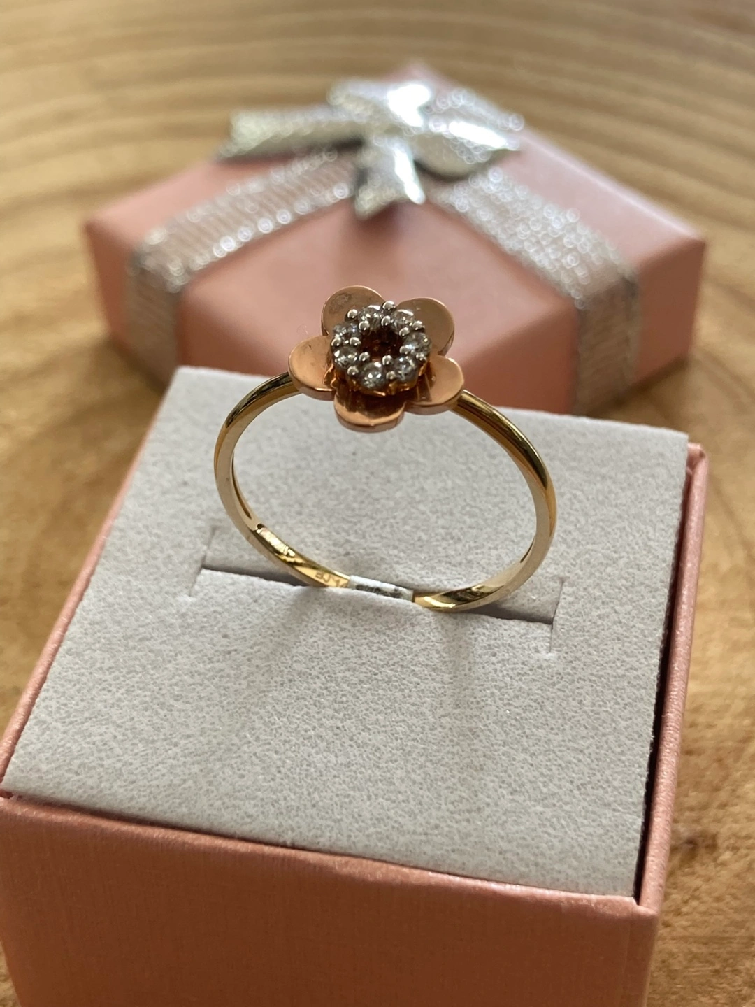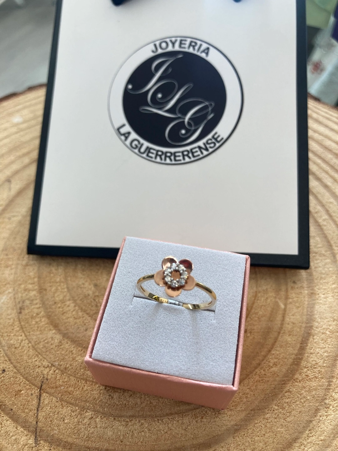 65Selling a beautiful real gold 14k ring with a flower design. It comes in a cute pink box, perfect for gifting or keeping it safe. The ring features a lovely flower on top, adorned with small diamonds or crystals for a touch of sparkle ( Hermoso Anillo dos oros amarillo oro rosa 14k original con piedra zirconia en forma de flor para mujer un regalo perfecto para tu persona especial. O si ocupa medida diferente se puede arreglar con un costo extra hacemos reparaciones en oro y plata cambios de batería para los reloj tenemos el sistema de apartado en toda la joyería con tamos con financiamiento abierto de 9am a 7pm todos los días estamos ala orden!!!