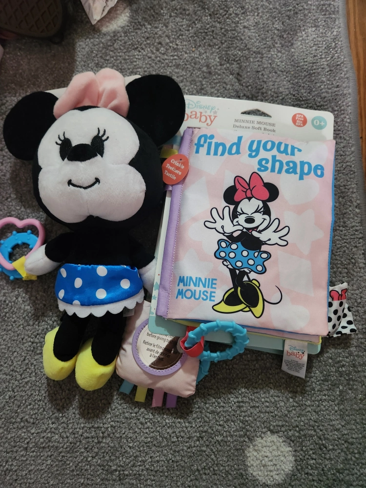 12I'm selling a Disney Baby Minnie Mouse Deluxe Soft Book! It is brand new and still in its original packaging. This soft book is perfect for babies 0+ months and features crinkle textures and tactile elements to help your little one explore their senses. It also helps them find their shape!