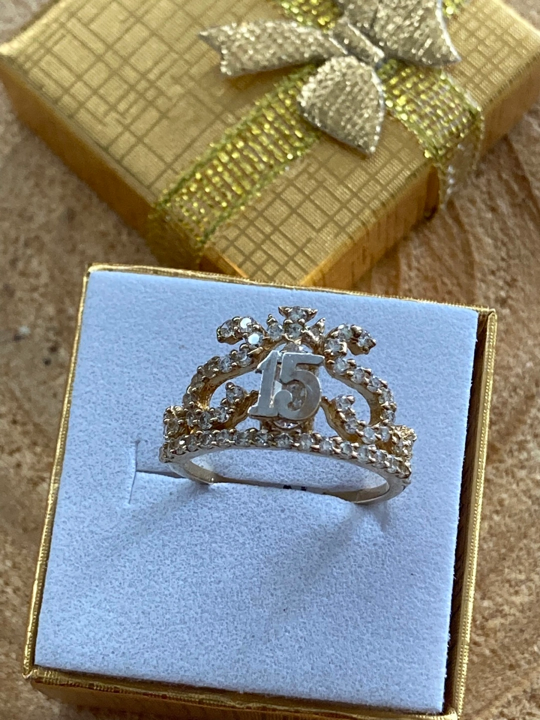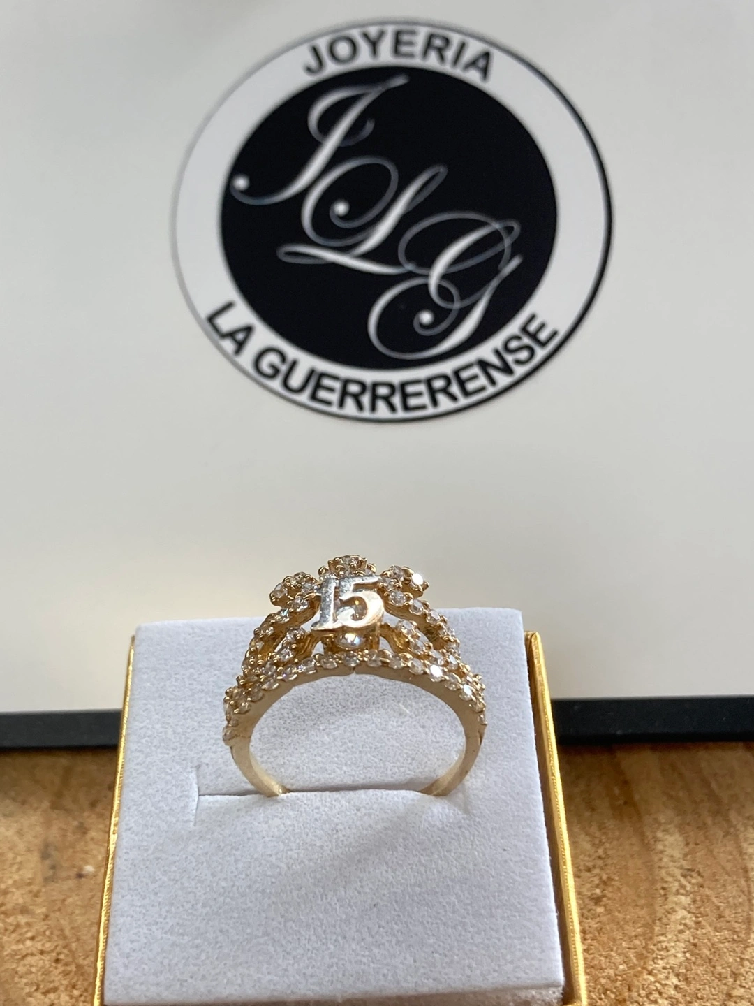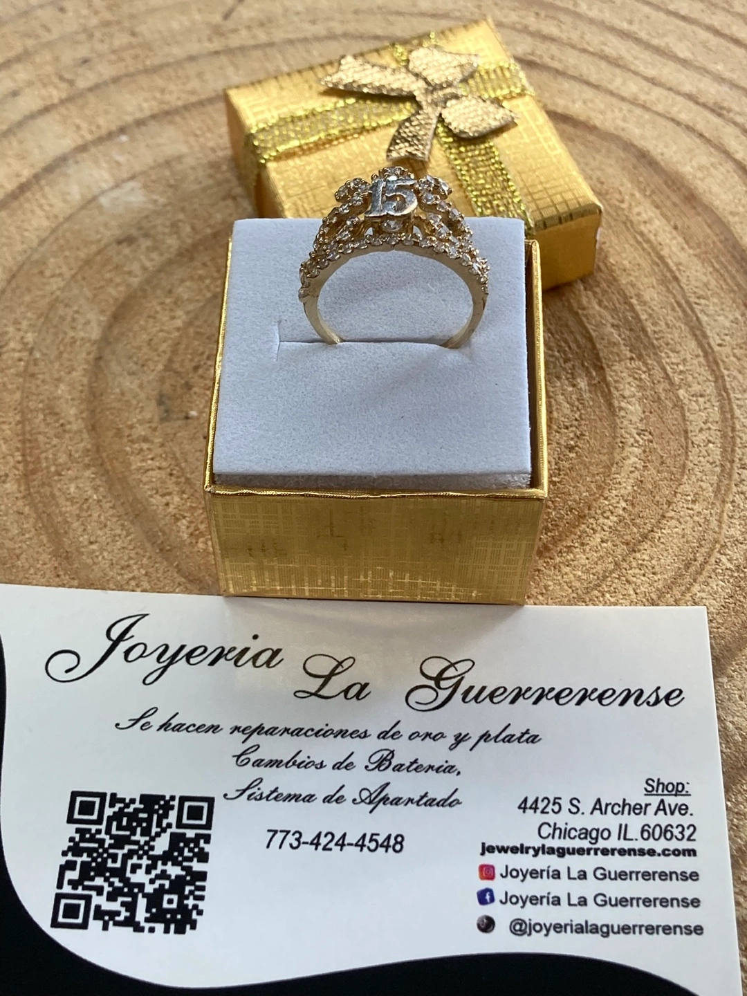 65Selling a Real gold 14k ring from Joyería La Guerrerense. It features a unique design with the number 15. Comes with its original box! Hermosos anillo en forma de corona para 15años con piedras zirconia oro 14k original ala venta medida 6.5 o si usted lo ocupa en diferente medida se puede arreglar con un costo extra. Hacemos reparación en oro y plata cambios de batería para los relojes. Con tamos con financiamiento en toda la joyería vendemos perfumes árabes estamos ala orden de 9am a 7pm todos los días