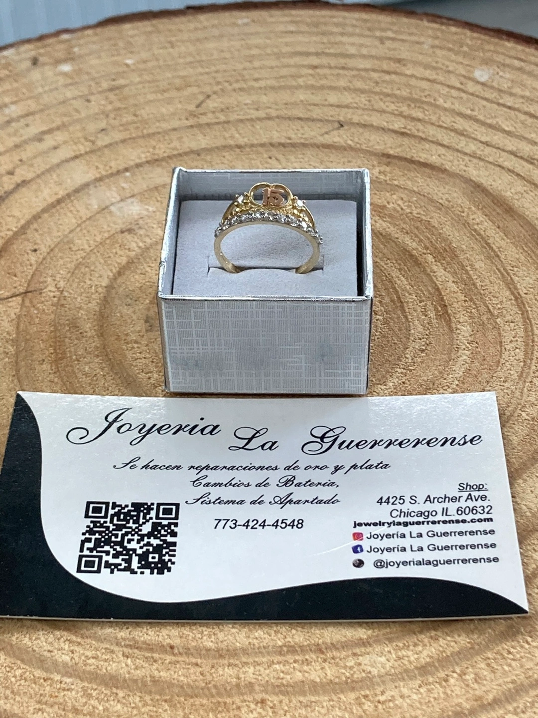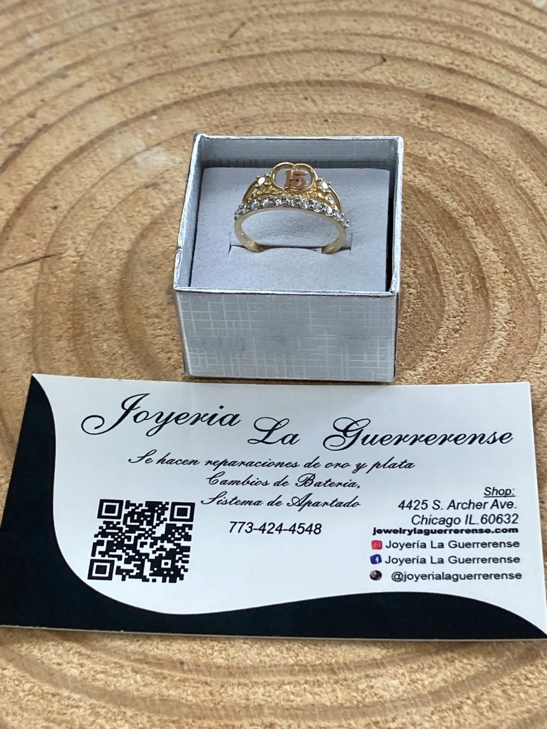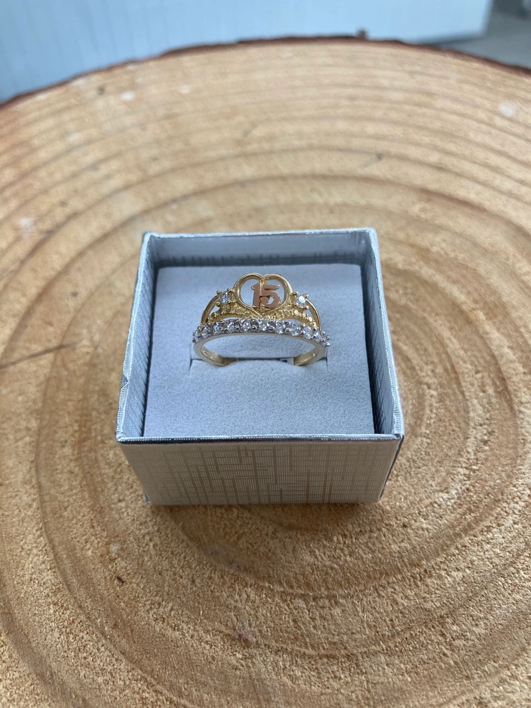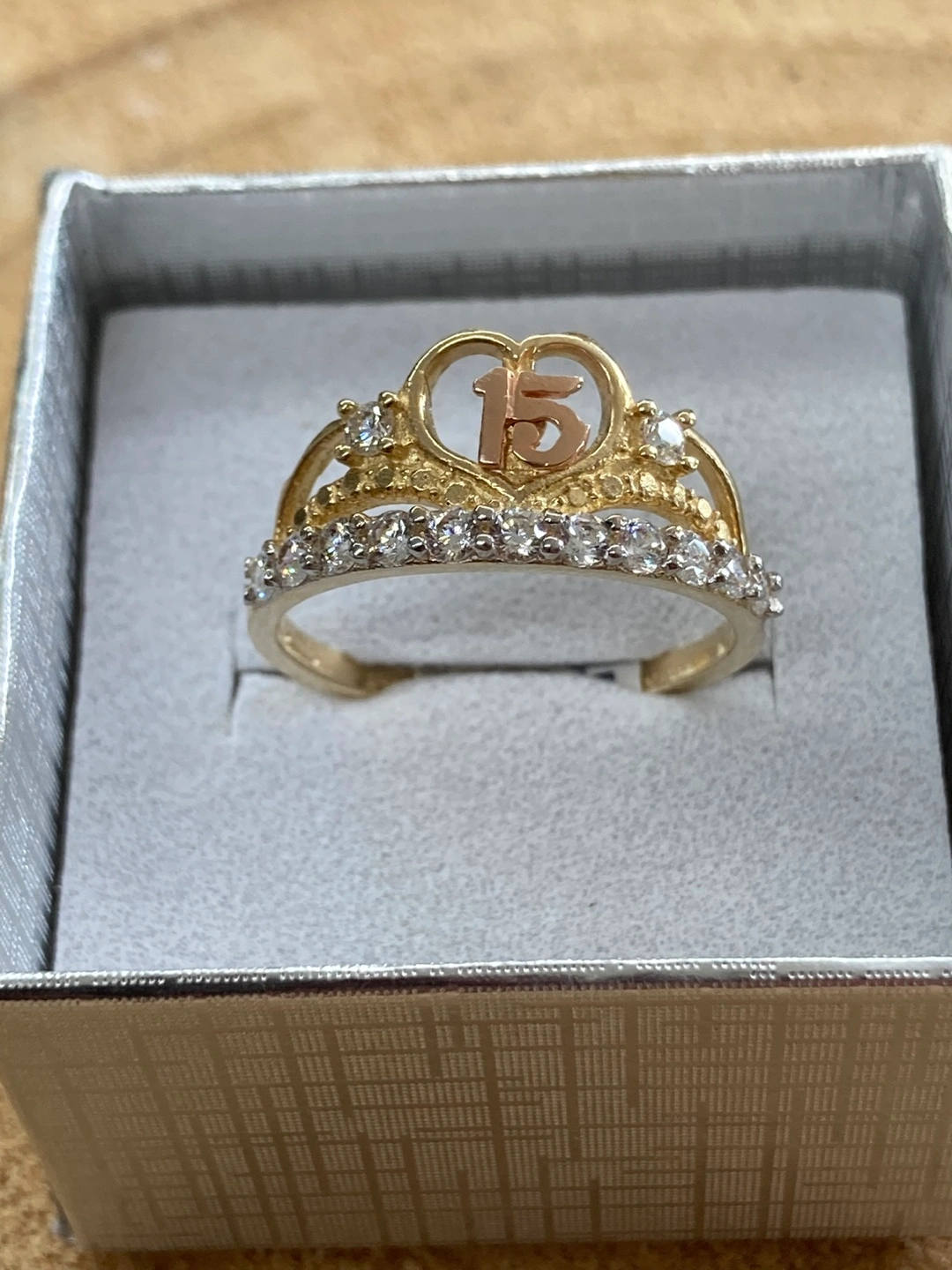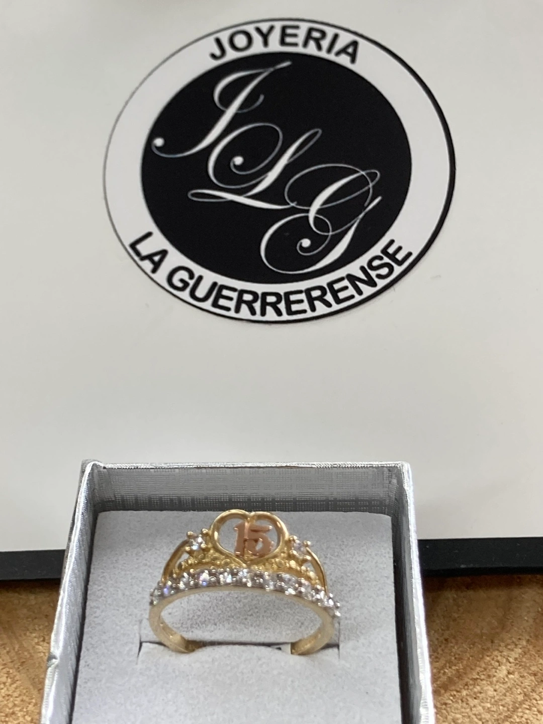 65Beautiful real gold 14k ring from Joyería La Guerrerense! This ring has a Real gold 14k band and is adorned with zirconia . The top of the ring has a heart with a 15 in the middle. It is in excellent condition and comes in a box. Hermoso anillo en forma de corona con piedras zirconia número 15 excelente para una quinceañera oro 14k original con medida 7. O si usted lo ocupa en otra medida diferente se puede arreglar con un cobro extra hacemos reparación en oro y plata cambios de batería para los relojes. Con tamos con sistema de apartado. Y financiamiento en toda la joyería estamos ala orden de 9am a 7pm todos los días