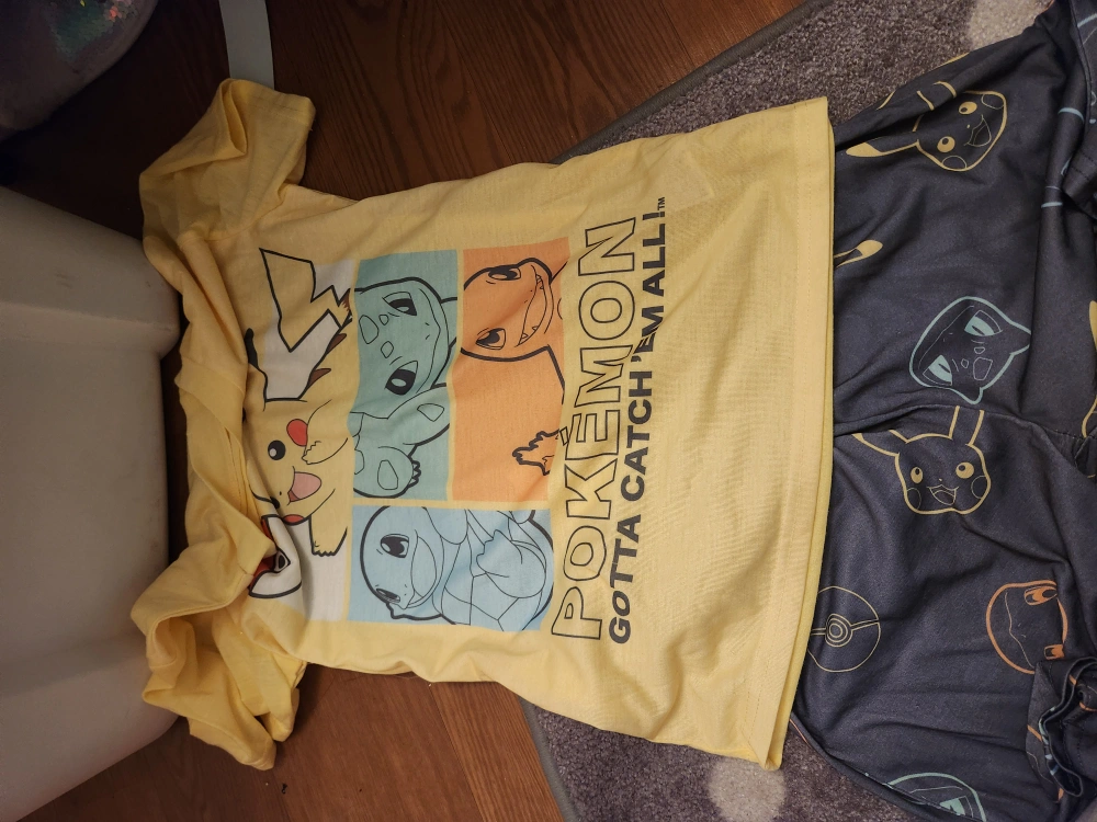 12Selling a cute Pokémon pajama set featuring Pikachu, Bulbasaur, Charmander, and Squirtle! The shirt is yellow and says "Pokémon Gotta Catch 'Em All!" The pants are gray with Pikachu designs all over I have 2 sets , each $9 size # M 8/10