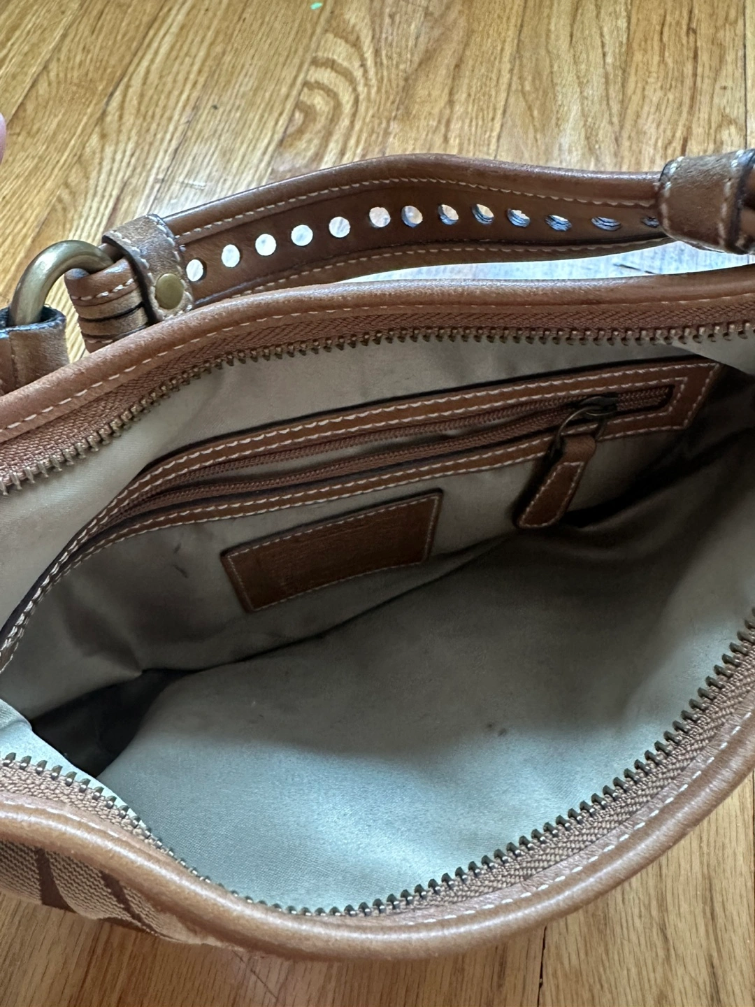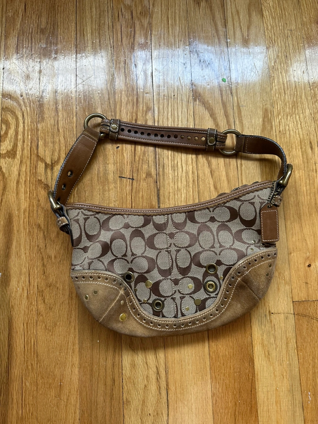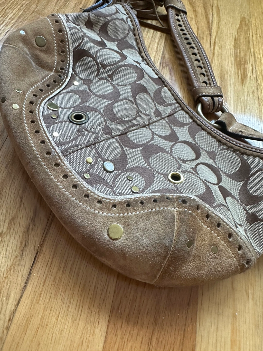 Selling a cute Coach hobo bag! It has a signature Coach print with suede accents and brass hardware. Perfect for everyday use!