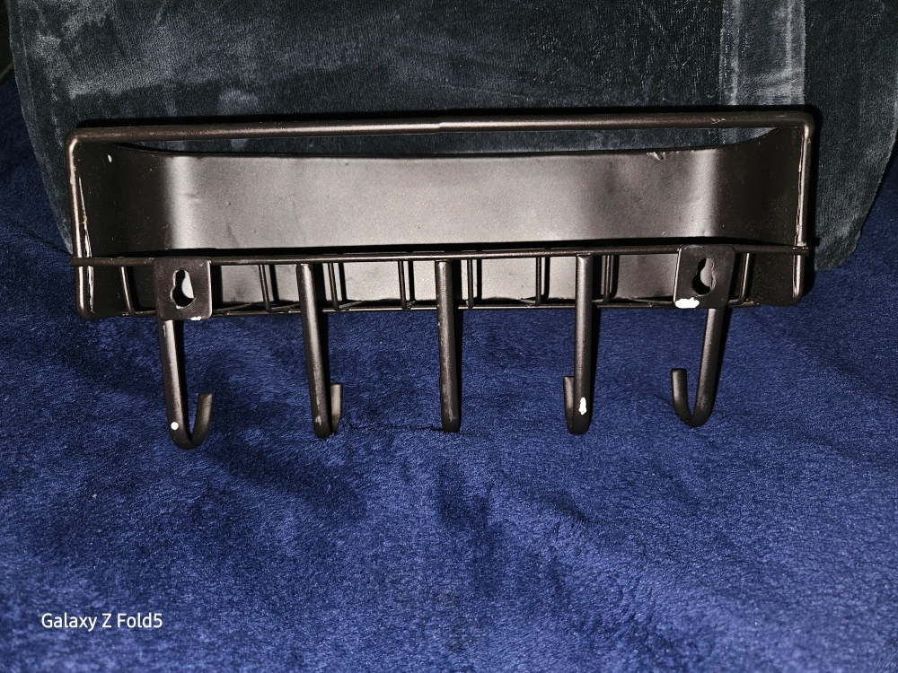 This is a brown wall-mounted rack with hooks. It's perfect for organizing keys, mail, or small items near your entryway. The rack is in great condition and ready to be mounted on your wall. It features a woven design on the front. (Screws not included) #Freecycle 🥕