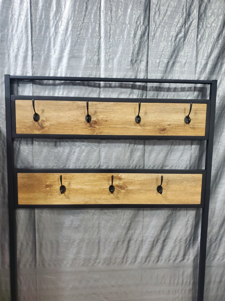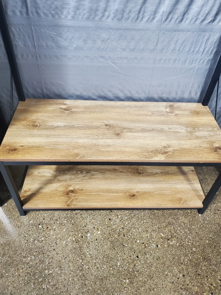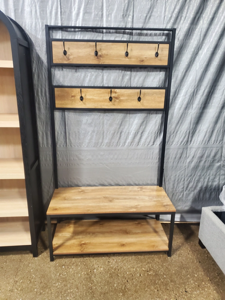 This hall tree is perfect for keeping your entryway organized! It features a bench for seating, a shelf for storage, and hooks for hanging coats and bags. The metal frame and wood-look shelves give it a modern, industrial style. It's in great condition and ready for a new home!