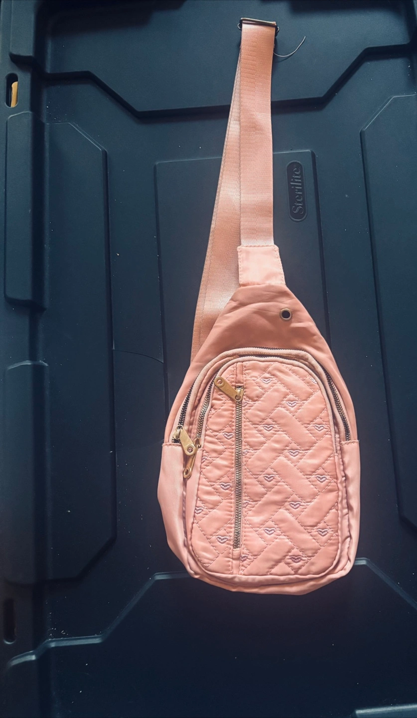 1000+Cute pink sling bag, perfect for everyday use! It has 3 outer pockets, and 1 inner pocket.