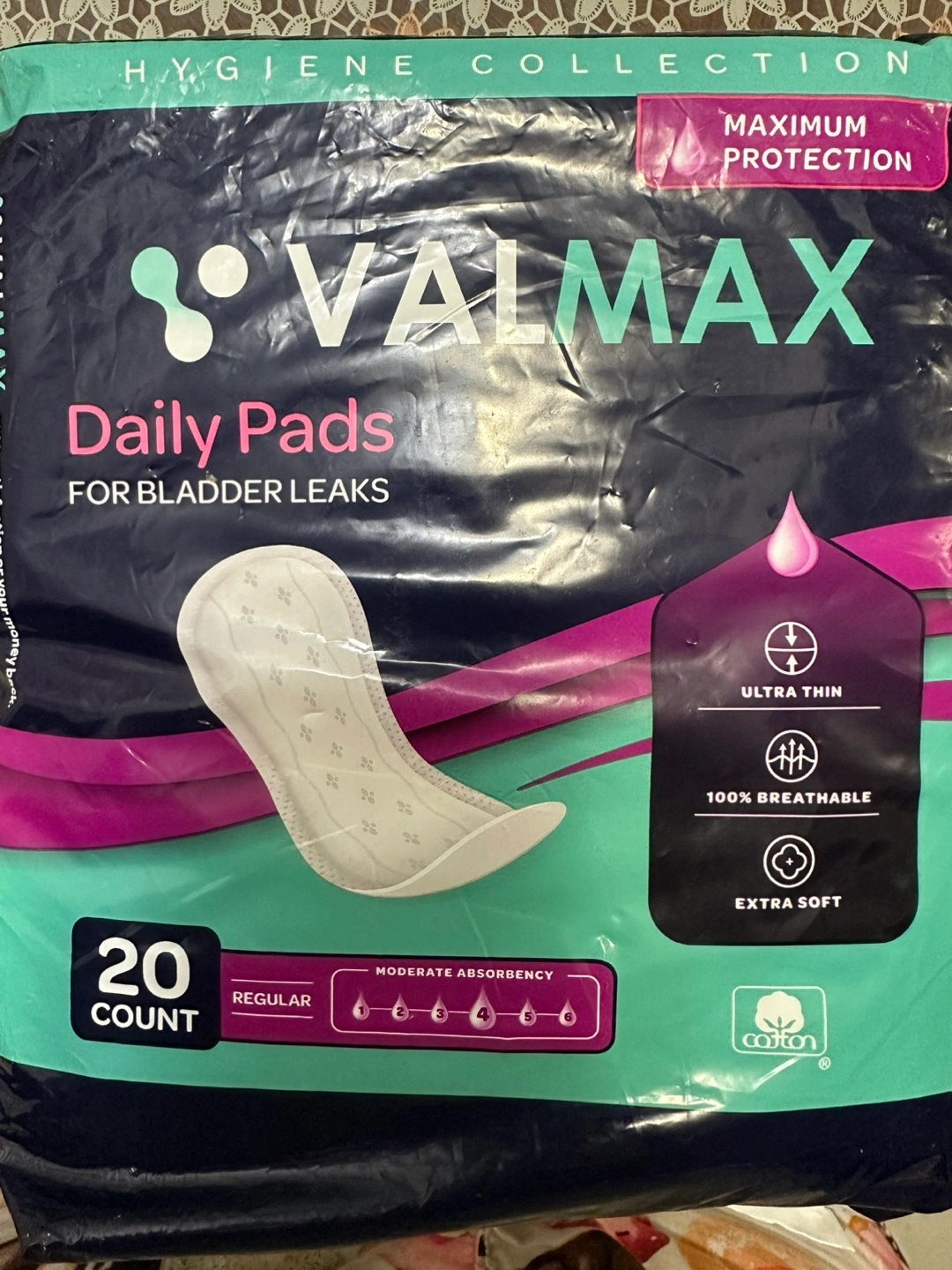 Selling a package of Valmax Daily Pads for bladder leaks. The package contains 20 regular pads with moderate absorbency. They are ultra-thin, 100% breathable, and extra soft