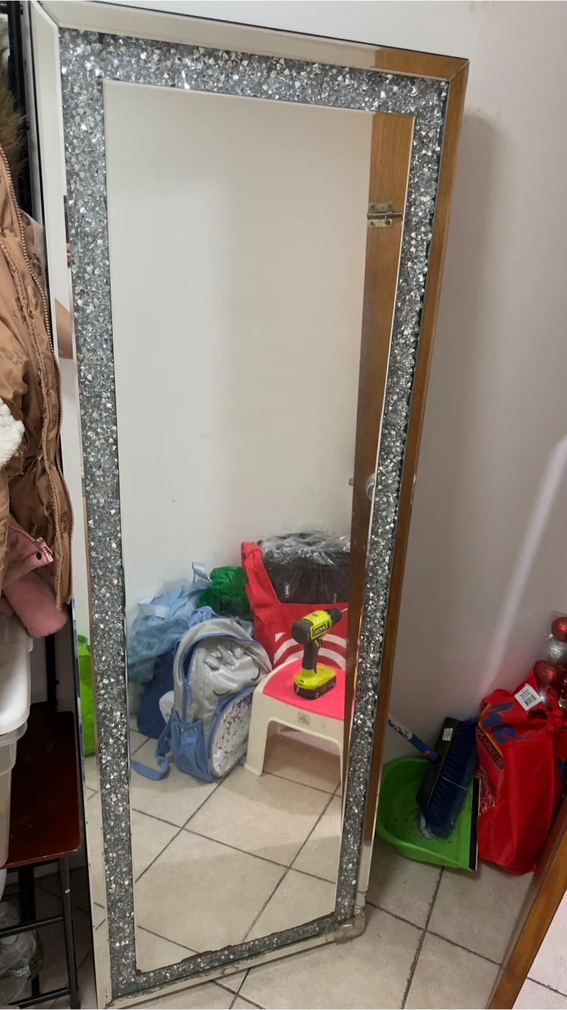 This tall mirror features a beautiful crushed crystal inlay around the frame. It's perfect for adding a touch of sparkle to any room! The frame is wood with a mirrored accent. It's a great statement piece for your entryway or bedroom.