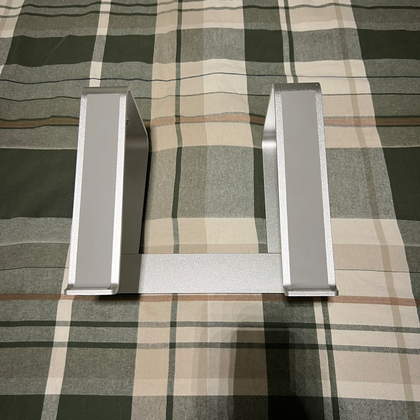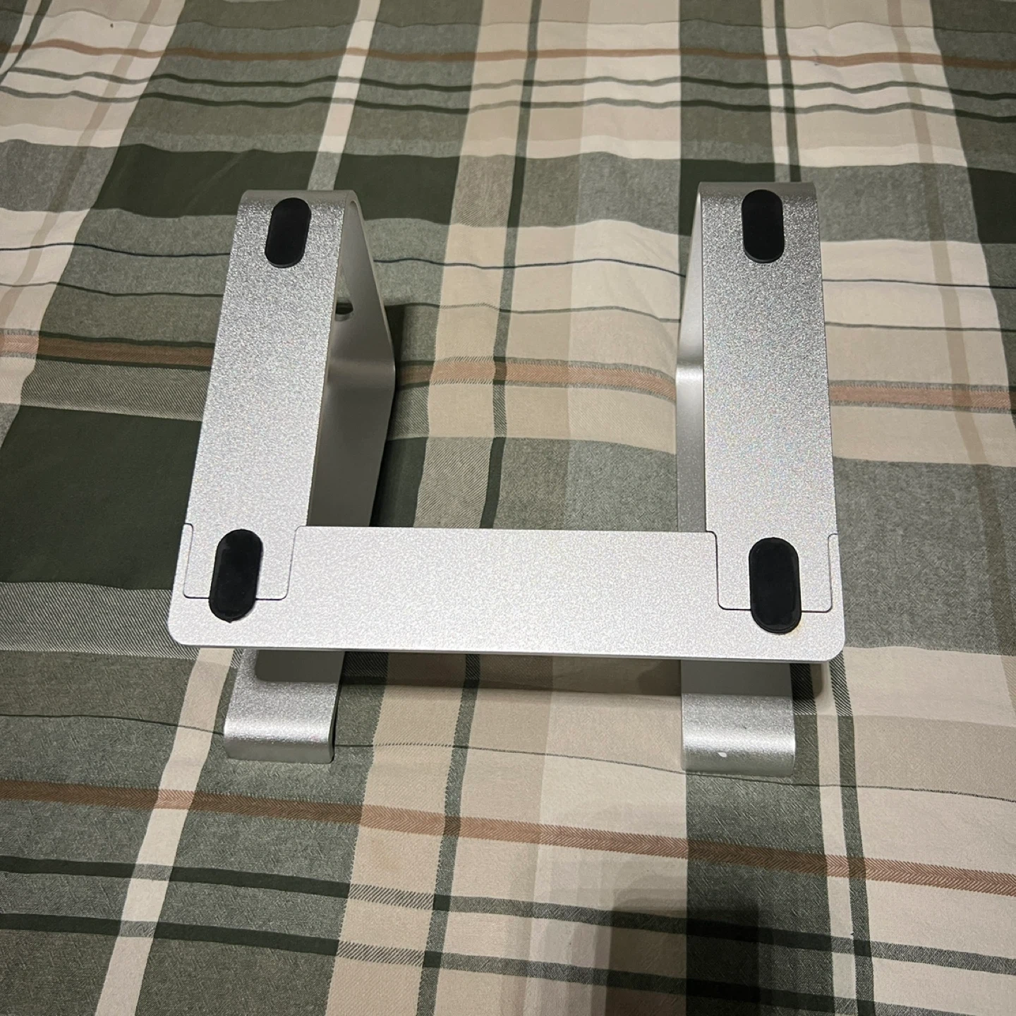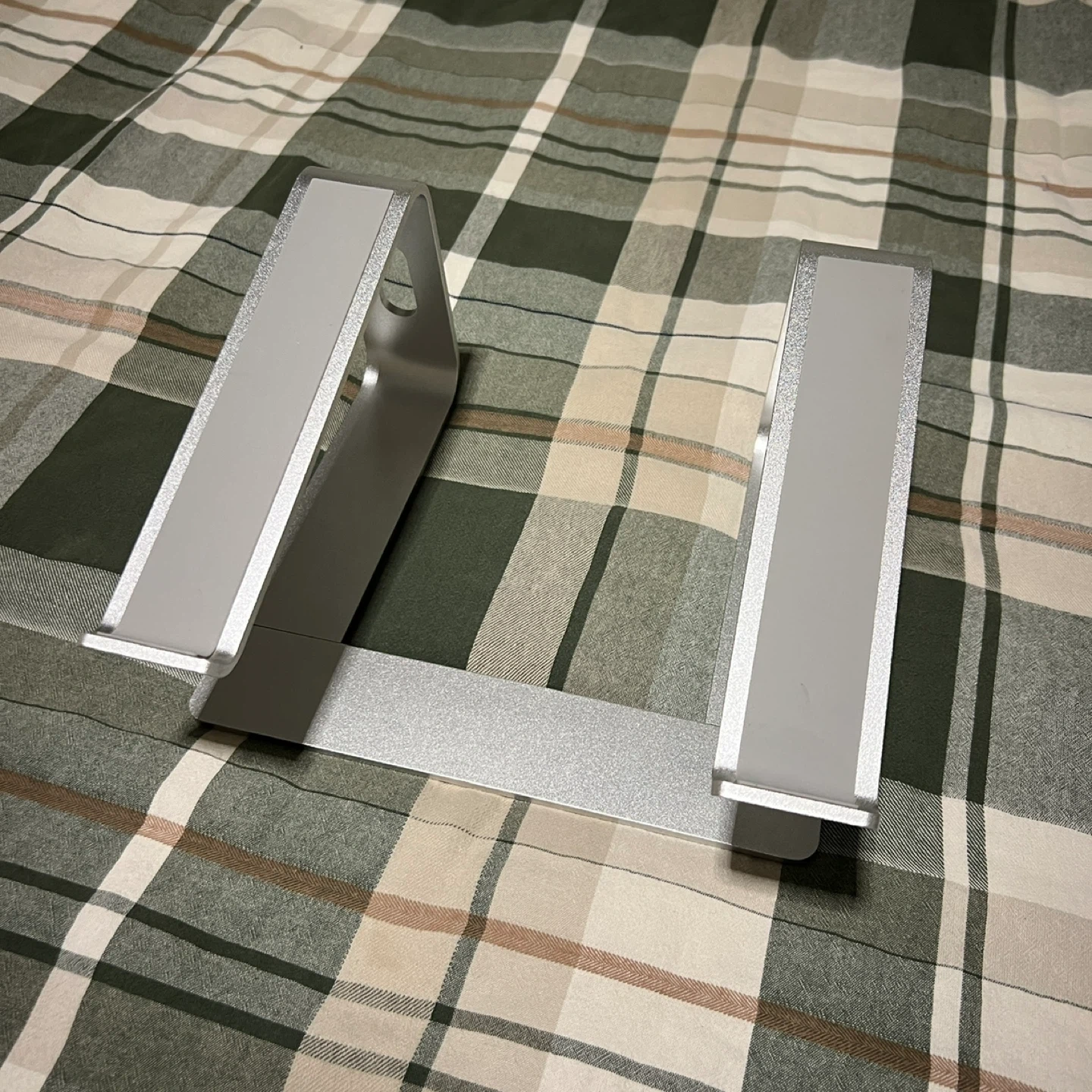 This is a silver laptop stand made of aluminum. It's designed to elevate your laptop for better airflow and a more comfortable viewing angle. The stand has rubber pads to prevent slipping.