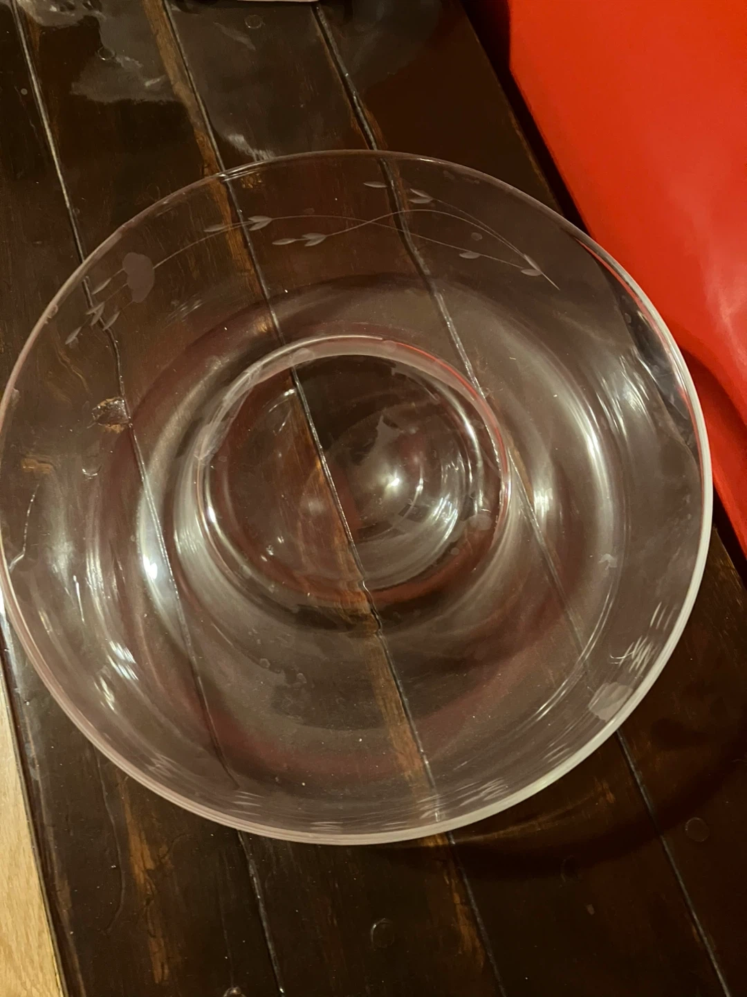 Selling a glass chip and dip bowl. It's in great condition and ready for your next gathering! Thick glass with beautiful etching on the sides