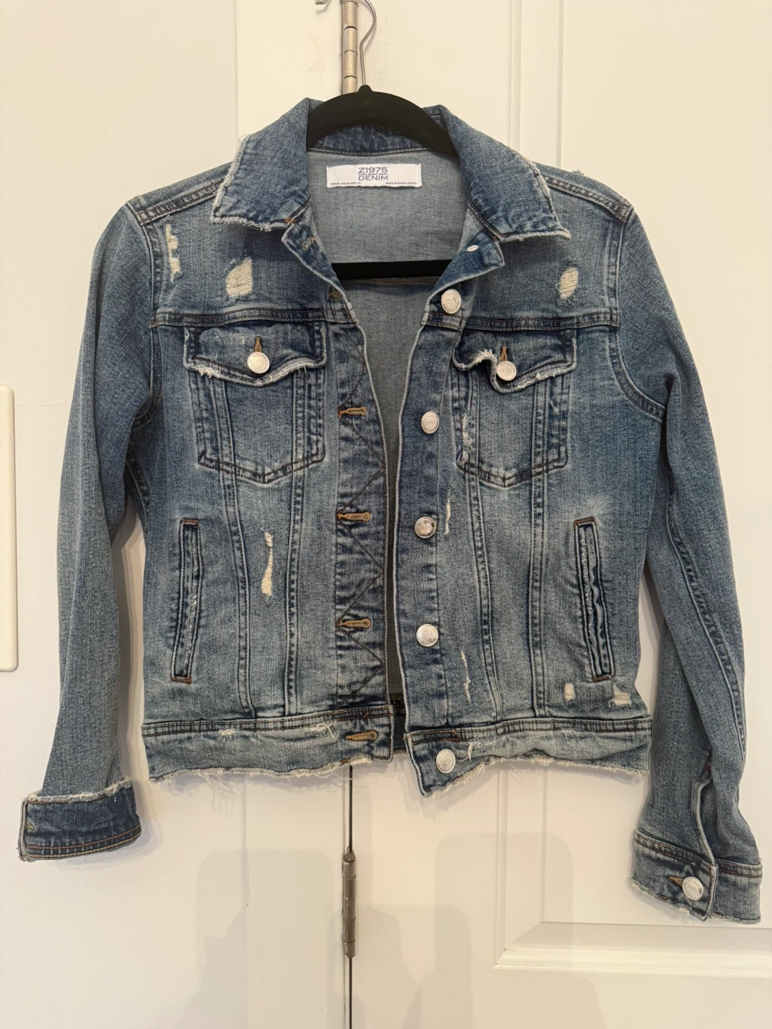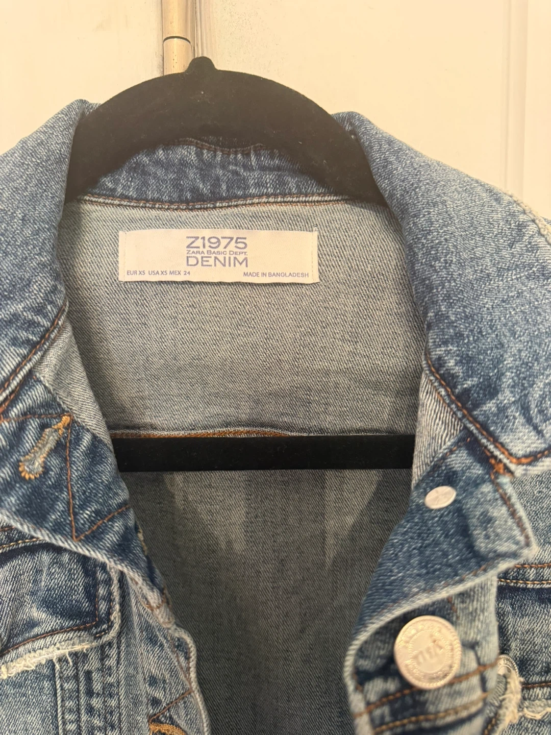 Zara Z1975 Denim jacket in a classic medium-wash blue with distressed details and a subtle raw/frayed hem for a cool, lived-in look. Features a button front, chest flap pockets, and side pockets—super easy to style over dresses, tees, or hoodies.