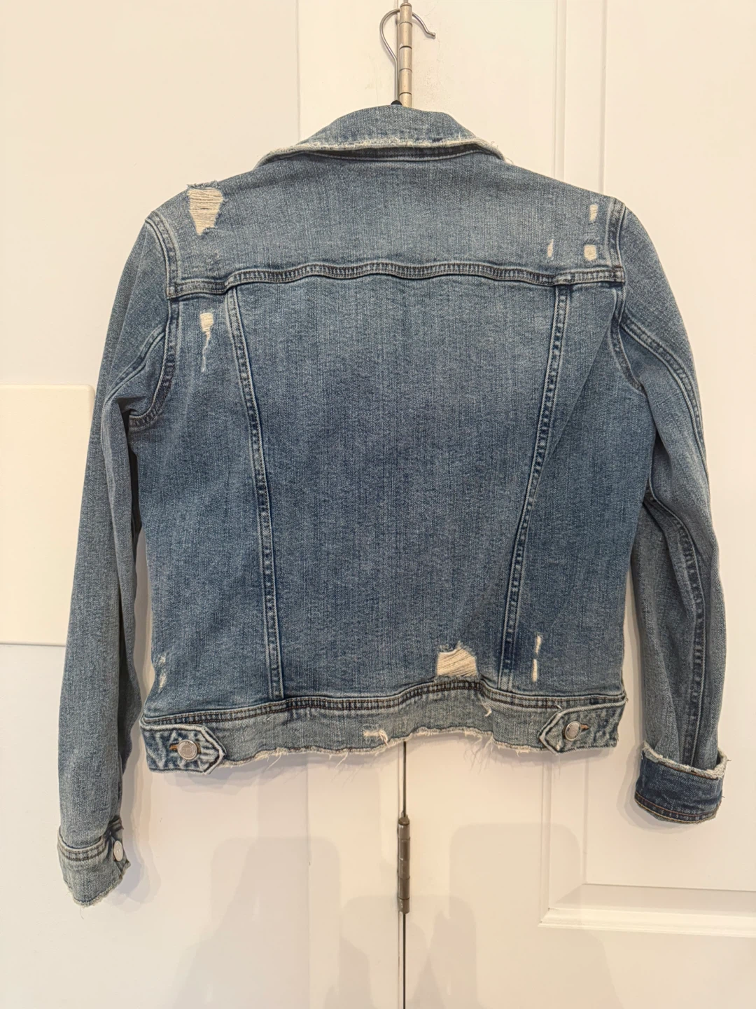 Zara Z1975 Denim jacket in a classic medium-wash blue with distressed details and a subtle raw/frayed hem for a cool, lived-in look. Features a button front, chest flap pockets, and side pockets—super easy to style over dresses, tees, or hoodies.