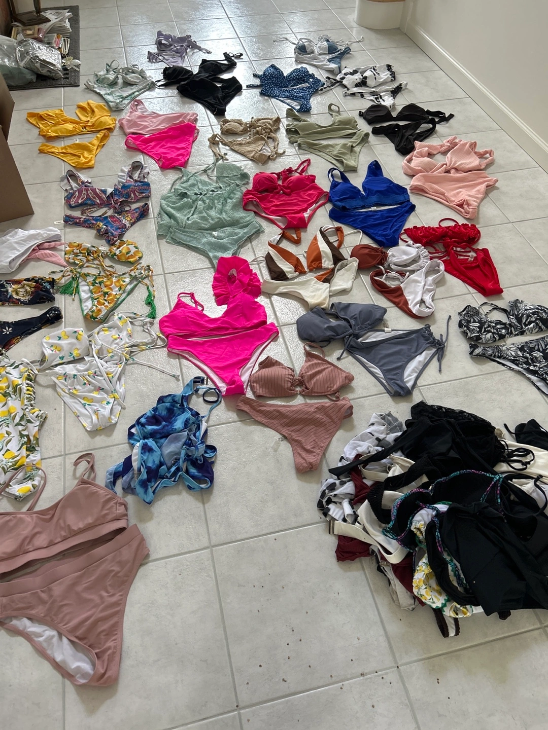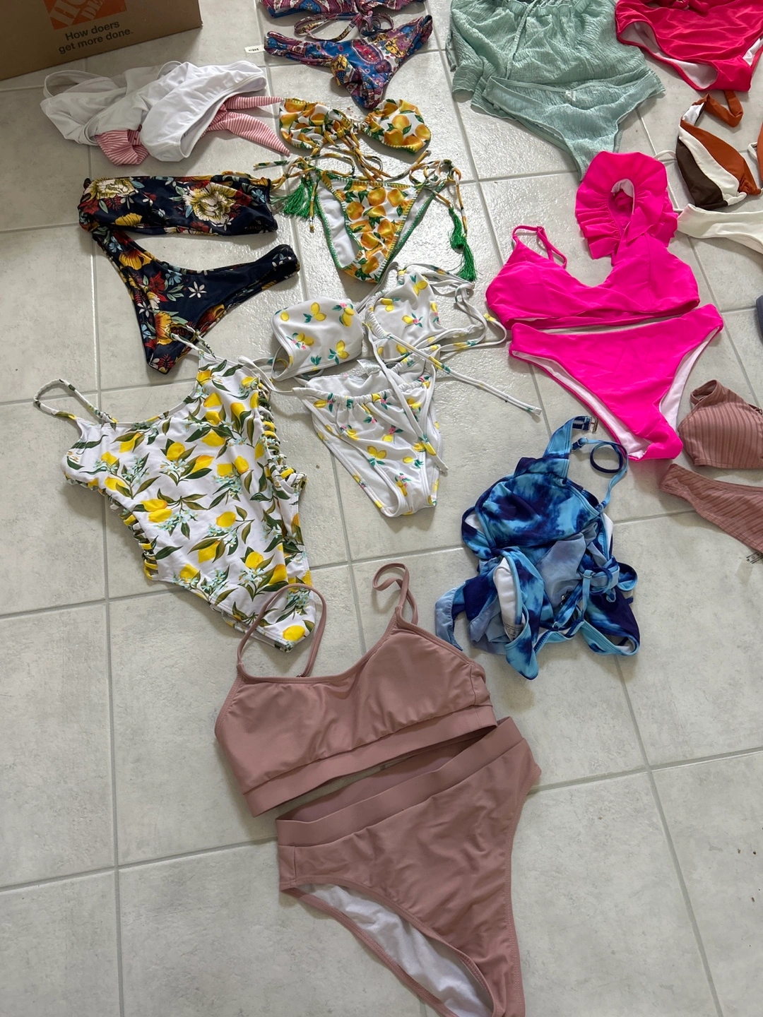 Selling a variety of swimsuits in different styles and colors! There are many different types including bikinis and one pieces. Perfect for the summer!