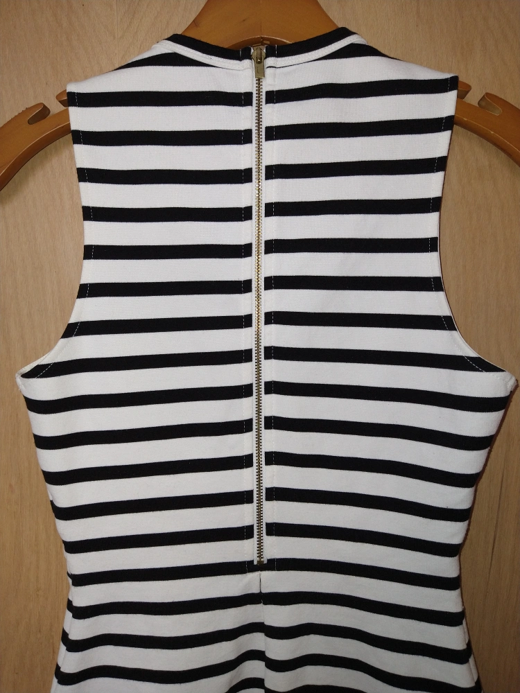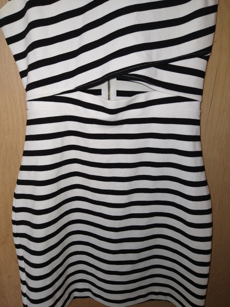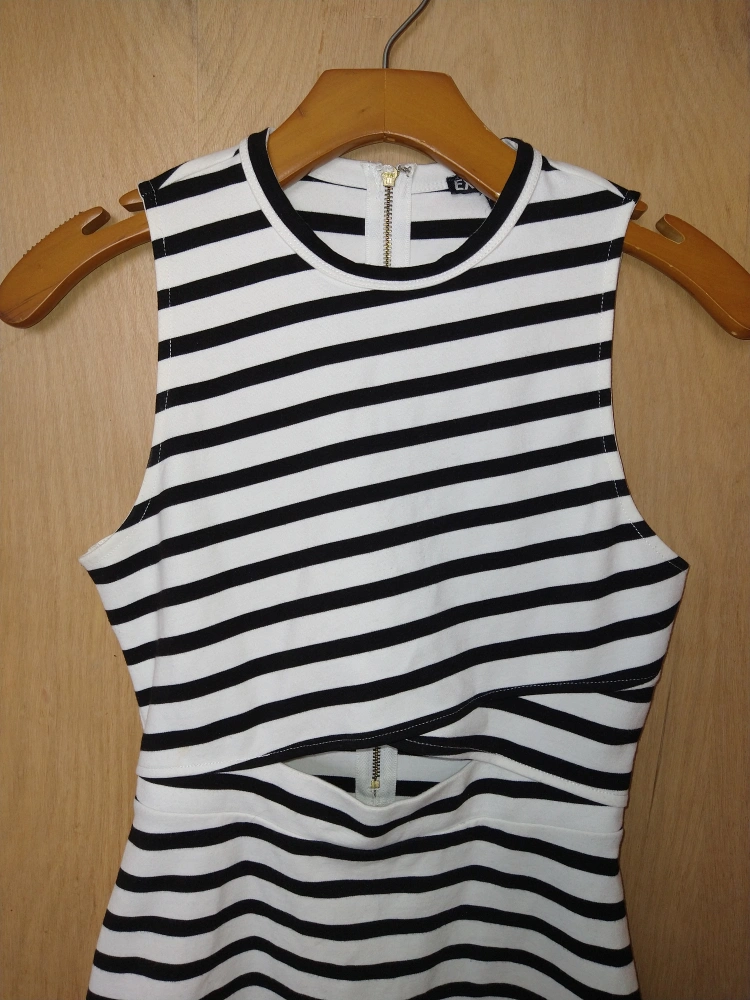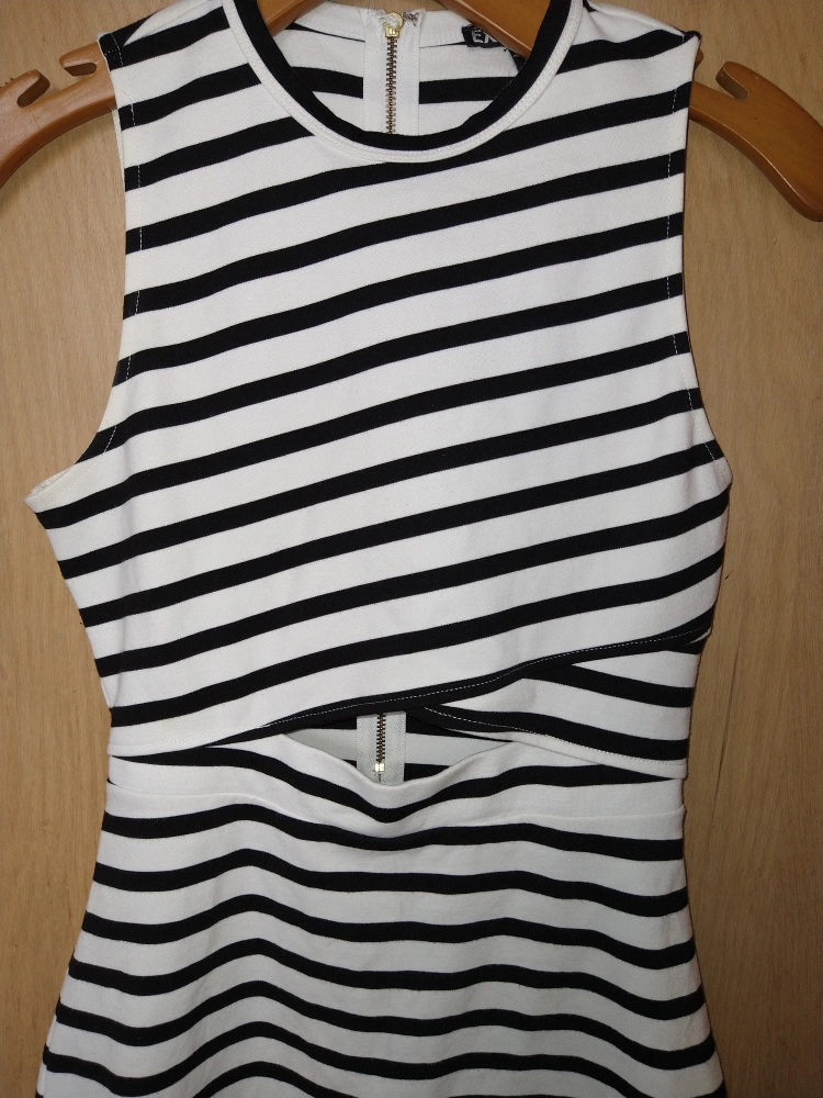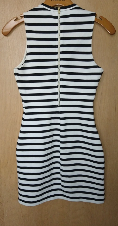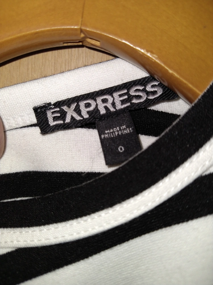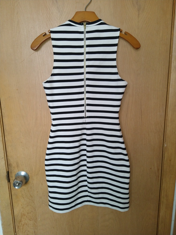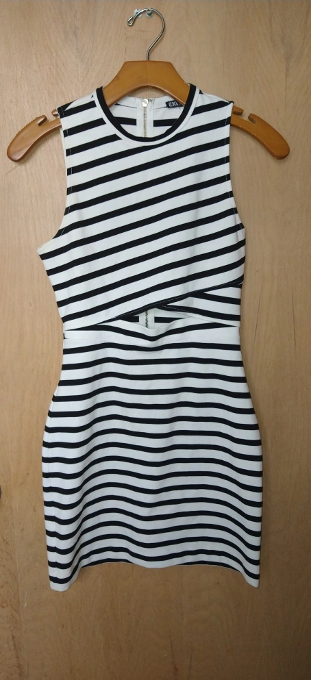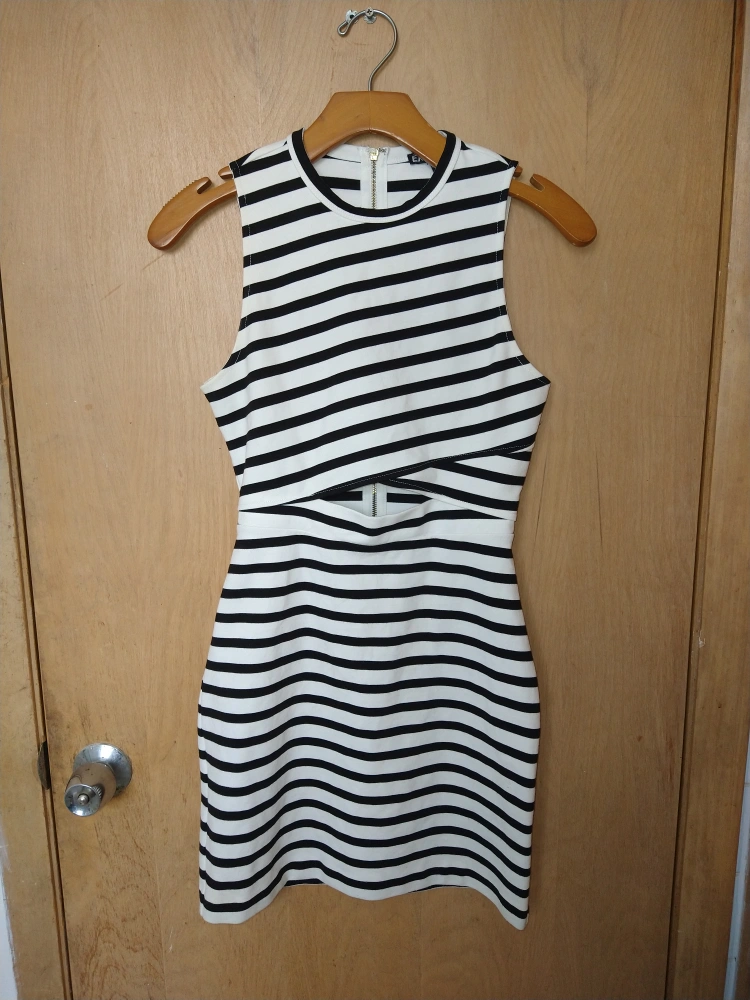 LIKE NEW!! This Express Black & White Striped Bodycon Dress in size 0 is a stylish and versatile option for various occasions. With a sleeveless design, scoop neck, and zip closure, this short dress is perfect for a party or casual outing. Made from a blend of polyester, spandex, nylon, and rayon, the dress features a flattering fit and stretch for added comfort. The black and white stripes add a classic touch to the mini dress, making it a designer-inspired and sexy choice for the summer, fall, or spring seasons. Handmade in the Philippines, this dress is machine washable for easy care.