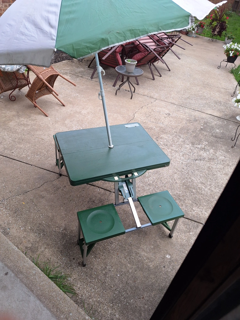 25This is a folding picnic table with an umbrella hole in the center. It's a great portable option for outdoor dining or activities. It features a green tabletop and seats, with a silver-colored folding frame. Perfect for picnics, camping, or backyard gatherings! for small child also umbrella ๐ included.