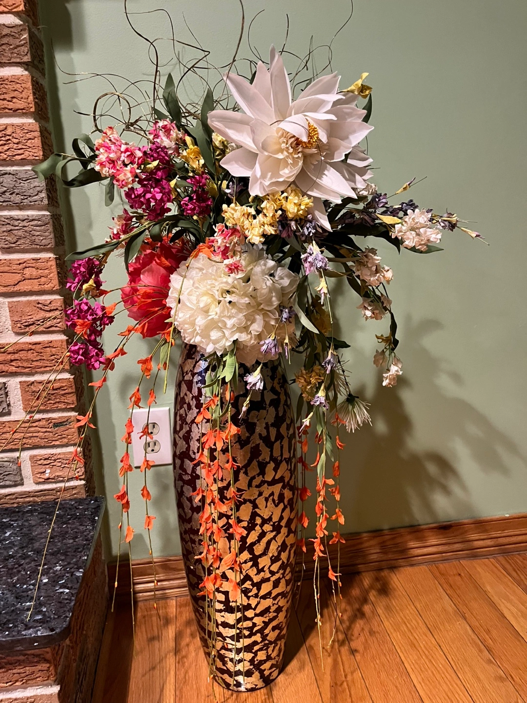 Beautiful floral arrangement in a decorative vase, perfect for adding a touch of elegance to any room! The vase has a unique pattern and complements the flowers nicely