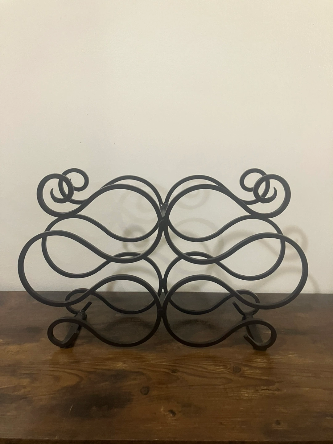 Selling a metal wine rack in black. It's in great condition and ready to hold your favorite bottles of wine. The rack has a decorative design that will look great in any home. Perfect for a countertop or bar area. Holds 6 wine bottles.