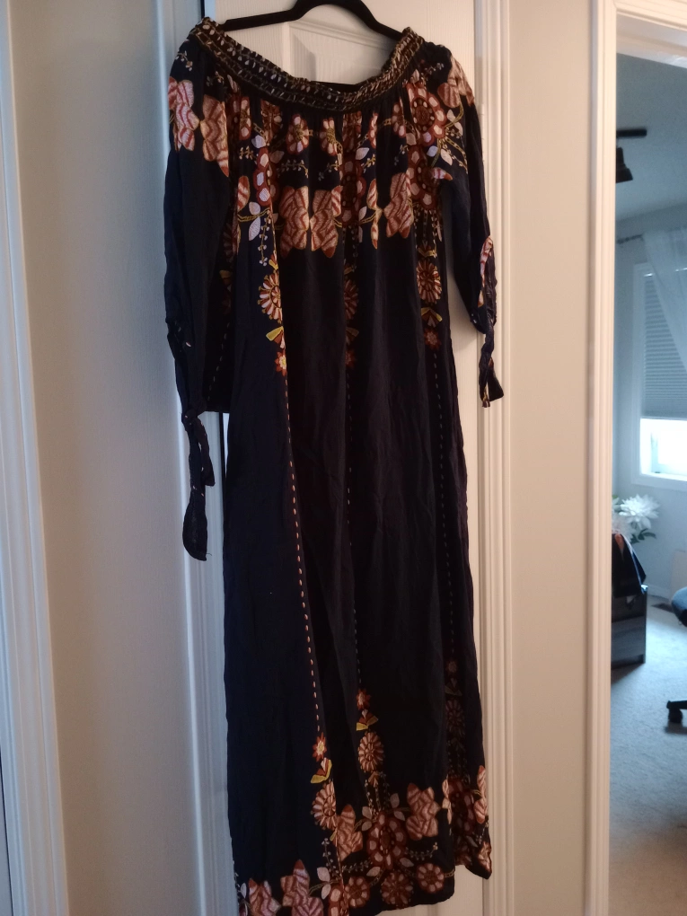 I'm selling a beautiful, gently warn floral maxi dress that's perfect for a casual yet stylish look, featuring a comfortable rayon material with colourful floral pattern. This dress is teady for a new home.