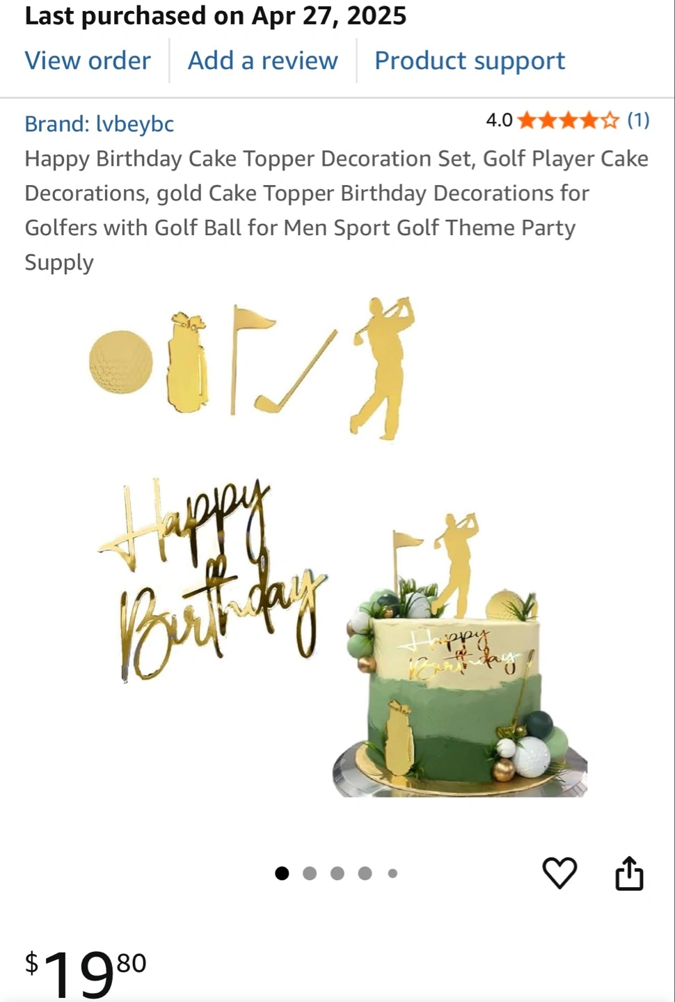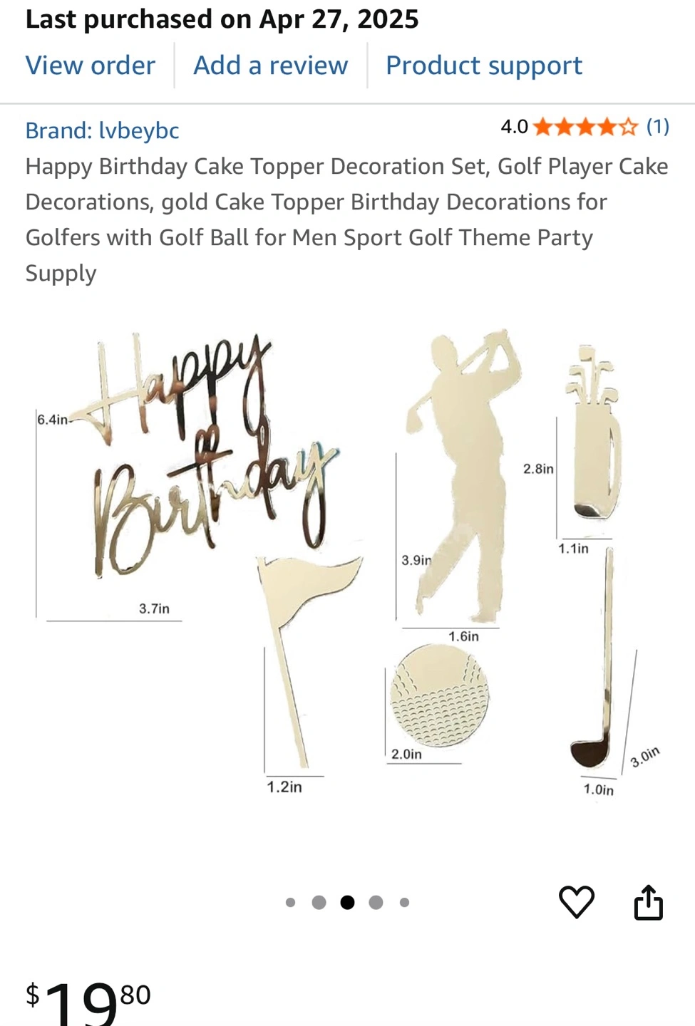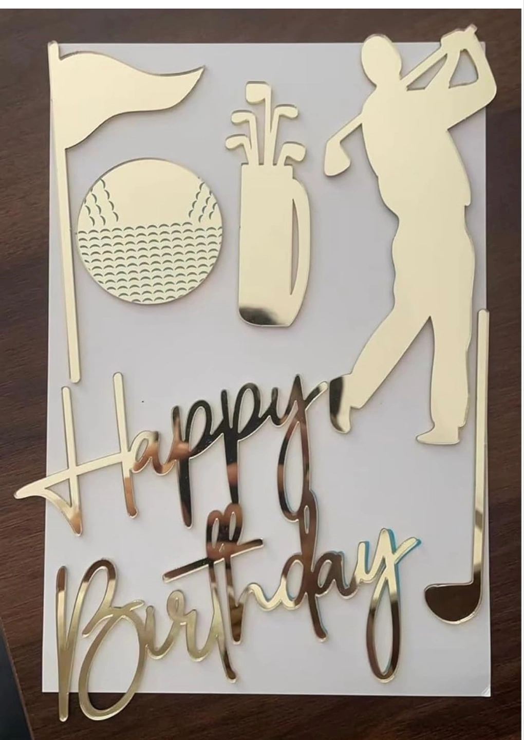 13Selling a Happy Birthday cake topper decoration set! It includes a golf player and golf-themed decorations. Perfect for a golf-themed birthday party! Gold Flag pole is broken separating from flag and pole but doesn’t affect anything