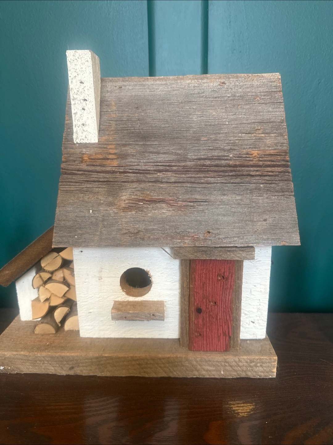 189Selling a charming rustic wooden birdhouse! It's got a cute design with a little stack of logs on the side and a red door. Perfect for adding a touch of country charm to your yard or garden