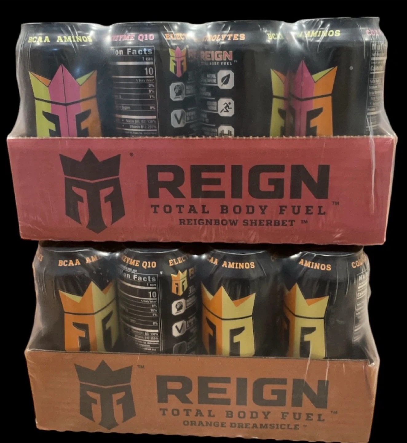 Two cases of Reign Total Body Fuel, 24 cans total they are 16 oz each! Flavors include Rainbow Sherbet and Orange Dreamsicle. Perfect for a boost of energy!