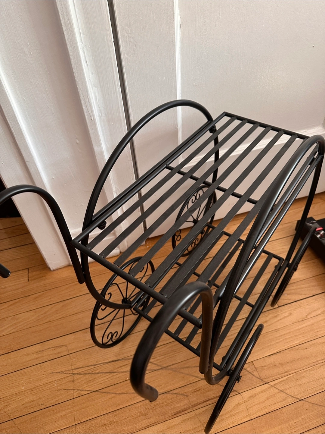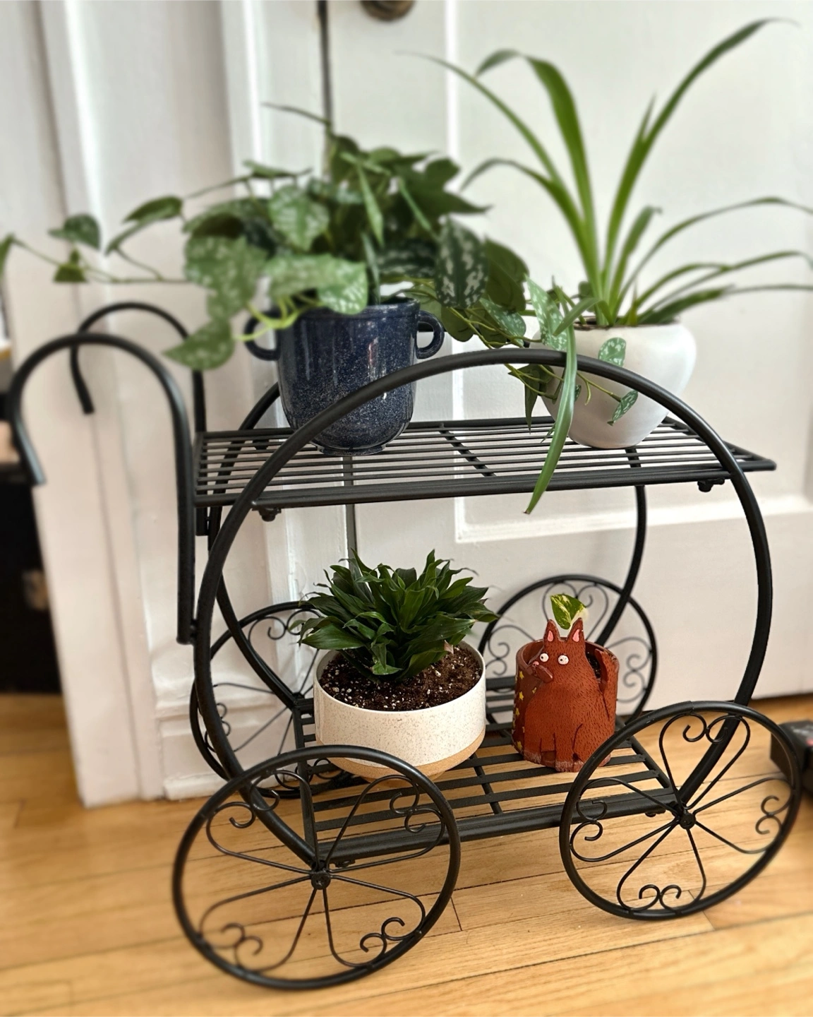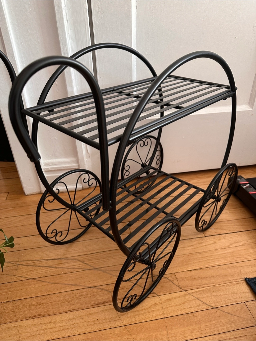 65Metal (cannot say if it’s been treated for outdoors but it’s an easy spray fix) Holds four plants comfortably (not included) or several smaller succulents Working wheels make this the perfect addition to any indoor/outdoor garden Handmade Usually goes for $250+ Wanted to keep it but moved and do not have the space/need to pay for school Cash/Venmo/Zelle Can deliver for $10 Dimensions: about 2’2” x 2’ x 11”